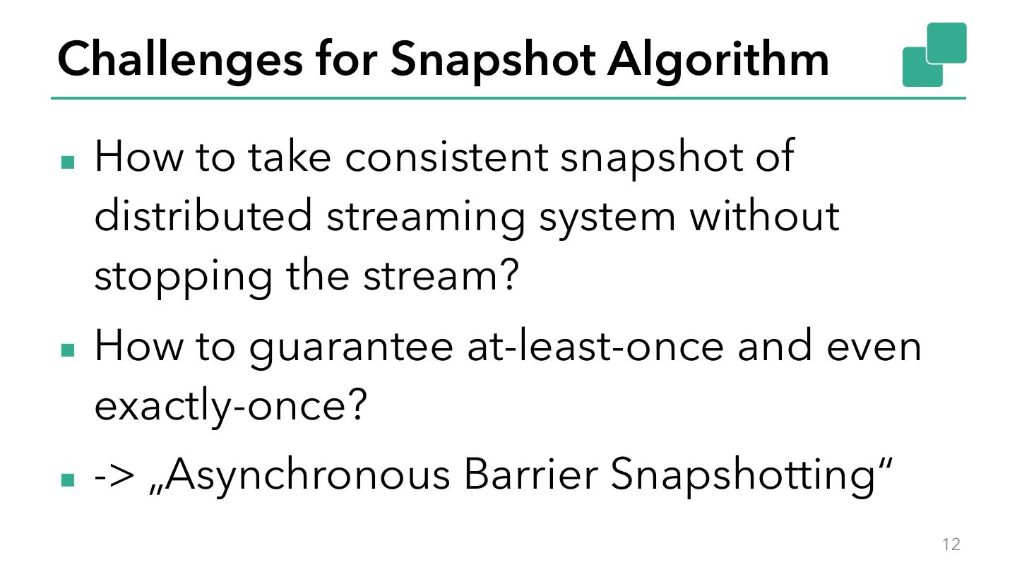 12 .Challenges for Snapshot Algorithm ▪ How to take consistent snapshot of distributed streaming system without stopping the stream? ▪ How to guarantee at-least-once and even exactly-once? ▪ -> „Asynchronous Barrier Snapshotting“ 12