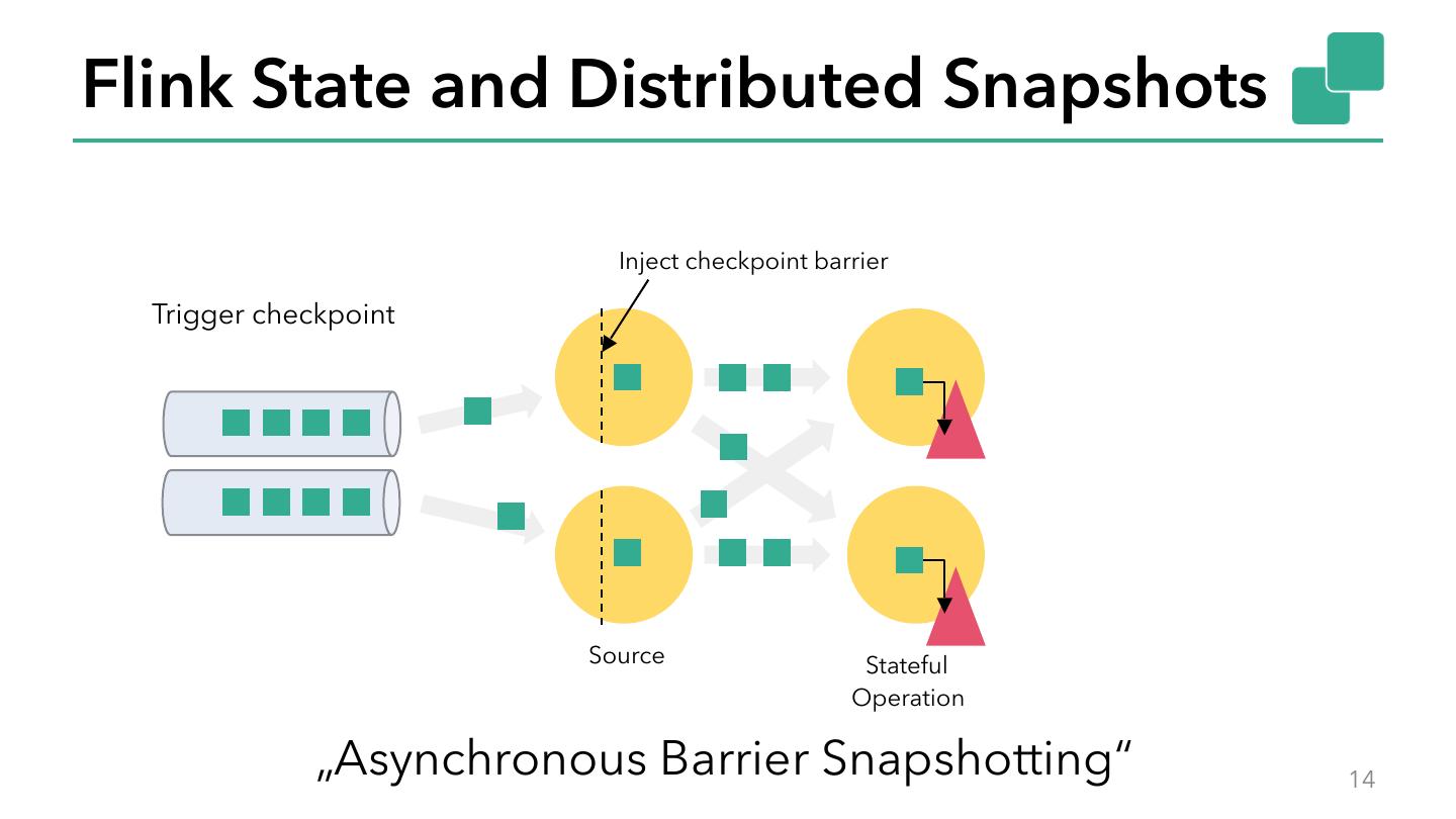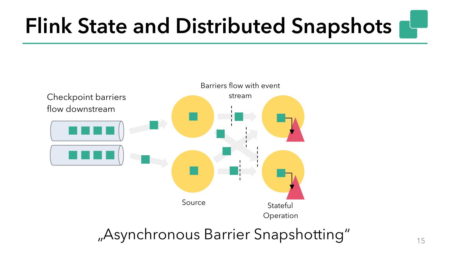 14 .Flink State and Distributed Snapshots Inject checkpoint barrier Trigger checkpoint Source Stateful Operation „Asynchronous Barrier Snapshotting“ 14