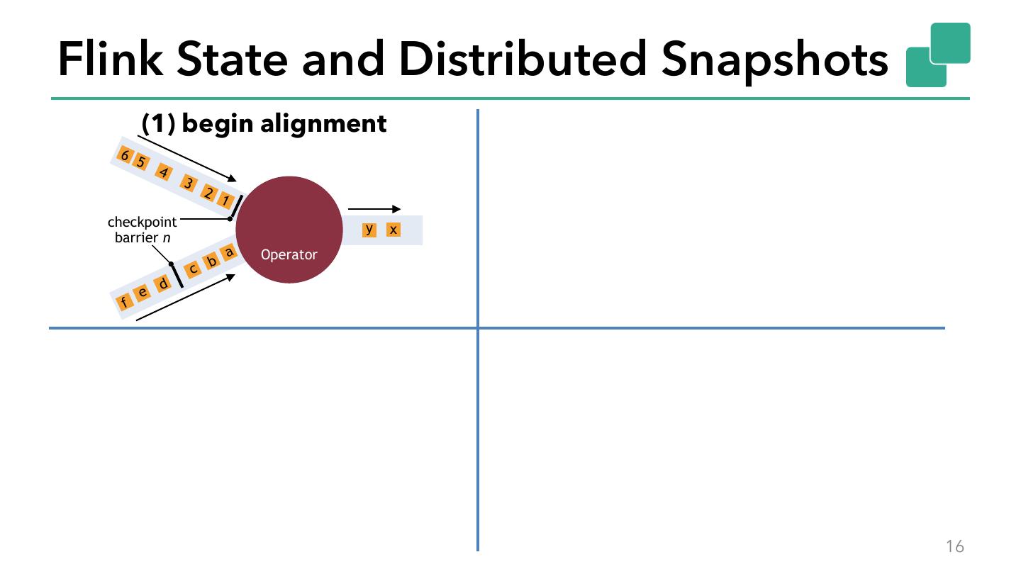15 .Flink State and Distributed Snapshots Barriers flow with event Checkpoint barriers stream flow downstream Source Stateful Operation „Asynchronous Barrier Snapshotting“ 15