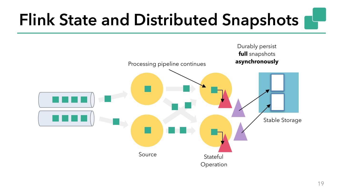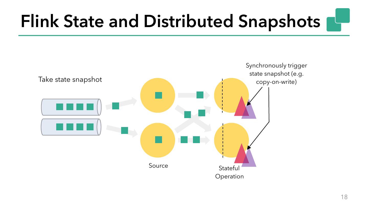 18 .Flink State and Distributed Snapshots Synchronously trigger state snapshot (e.g. Take state snapshot copy-on-write) Source Stateful Operation 18