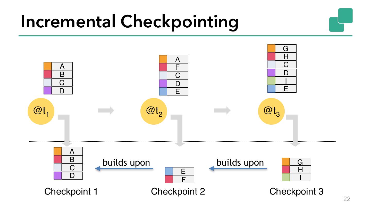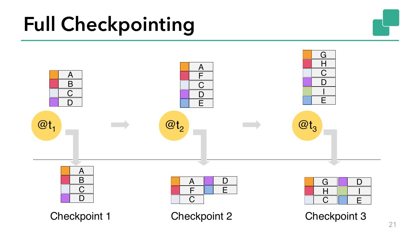 21 .Full Checkpointing G A H A F C B C D C D I D E E @t1 @t2 @t3 A B A D G D C F E H I D C C E Checkpoint 1 Checkpoint 2 Checkpoint 3 21