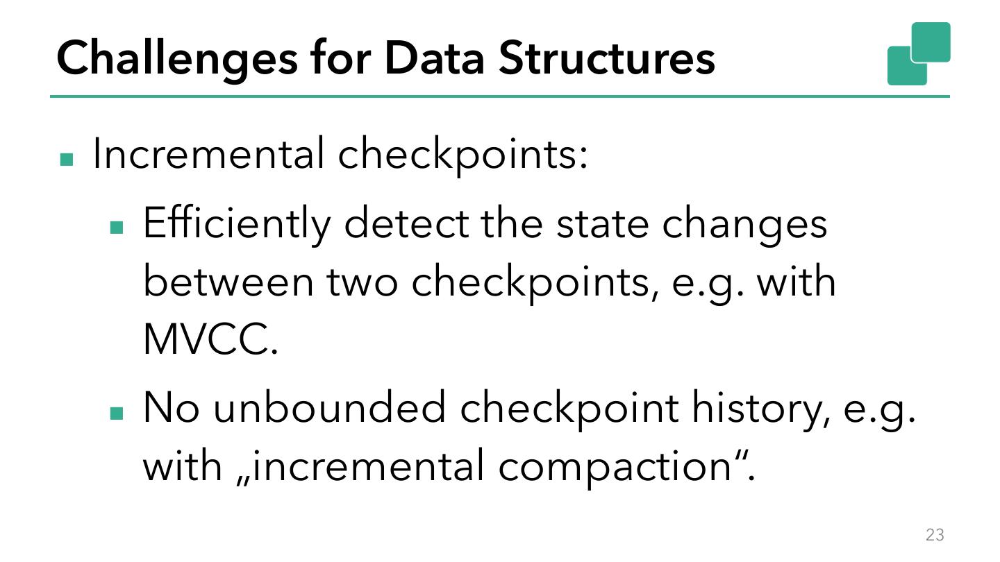23 .Challenges for Data Structures ▪ Incremental checkpoints: ▪ Efficiently detect the state changes between two checkpoints, e.g. with MVCC. ▪ No unbounded checkpoint history, e.g. with „incremental compaction“. 23