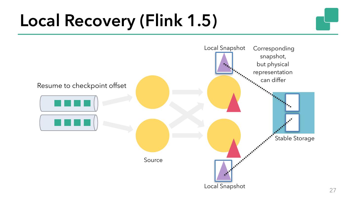 27 .Local Recovery (Flink 1.5) Local Snapshot Corresponding snapshot, but physical representation can differ Resume to checkpoint offset Stable Storage Source Local Snapshot 27
