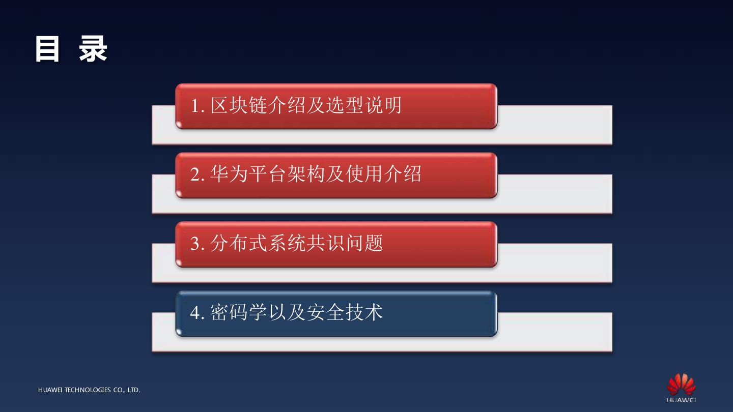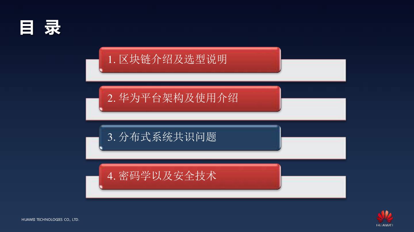 3 .目 录 1. 区块链介绍及选型说明 2. 华为平台架构及使用介绍 3. 分布式系统共识问题 4. 密码学以及安全技术 HUAWEI TECHNOLOGIES CO., LTD.