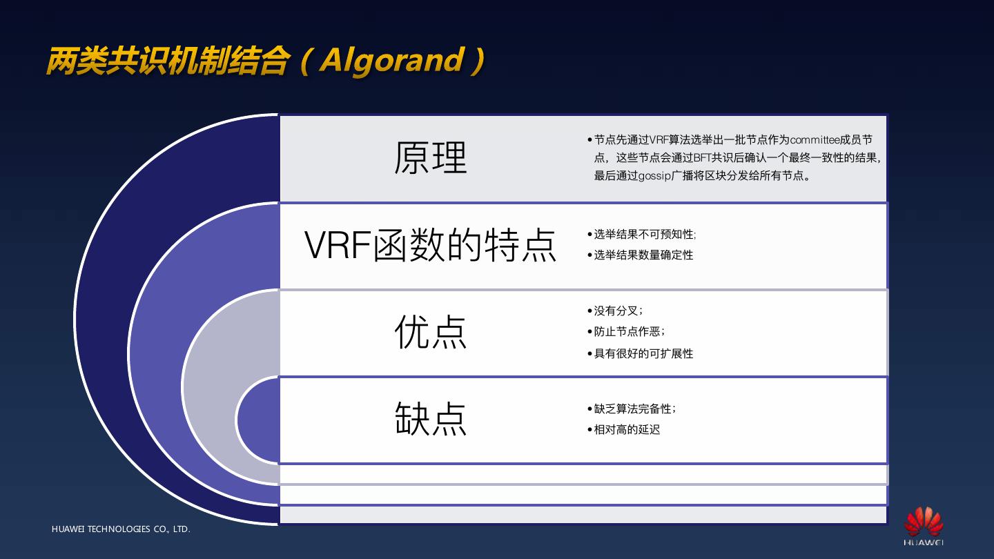 8 . 原理理 • 节点先通过VRF算法选举出⼀一批节点作为committee成员节 点,这些节点会通过BFT共识后确认⼀一个最终⼀一致性的结果, 最后通过gossip⼴广播将区块分发给所有节点。 • 选举结果不不可预知性; VRF函数的特点 • 选举结果数量量确定性 • 没有分叉; 优点 • 防⽌止节点作恶; • 具有很好的可扩展性 缺点 • 缺乏算法完备性; • 相对⾼高的延迟 HUAWEI TECHNOLOGIES CO., LTD.