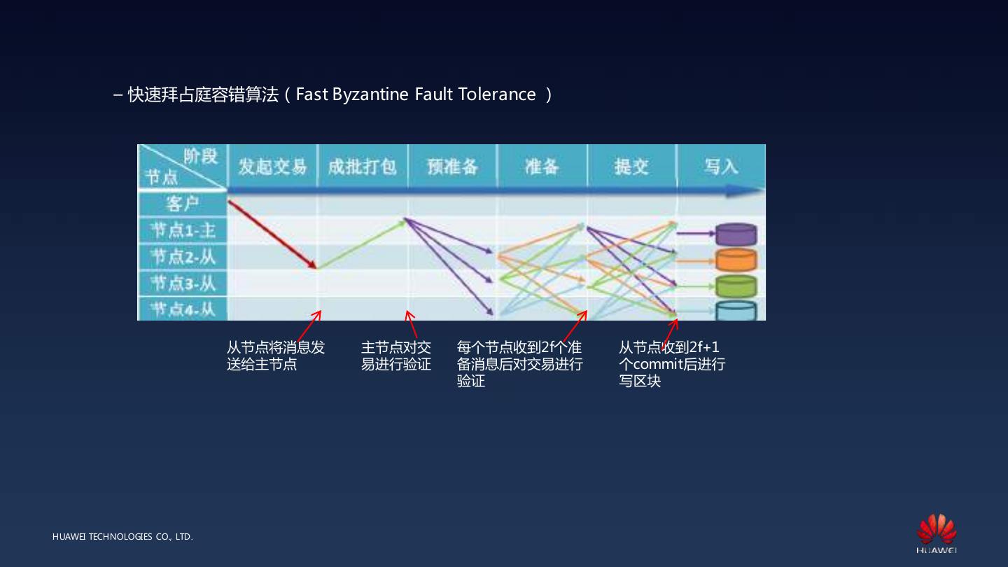 10 . – 快速拜占庭容错算法(Fast Byzantine Fault Tolerance ) 从节点将消息发 主节点对交 每个节点收到2f个准 从节点收到2f+1 送给主节点 易进行验证 备消息后对交易进行 个commit后进行 验证 写区块 HUAWEI TECHNOLOGIES CO., LTD.