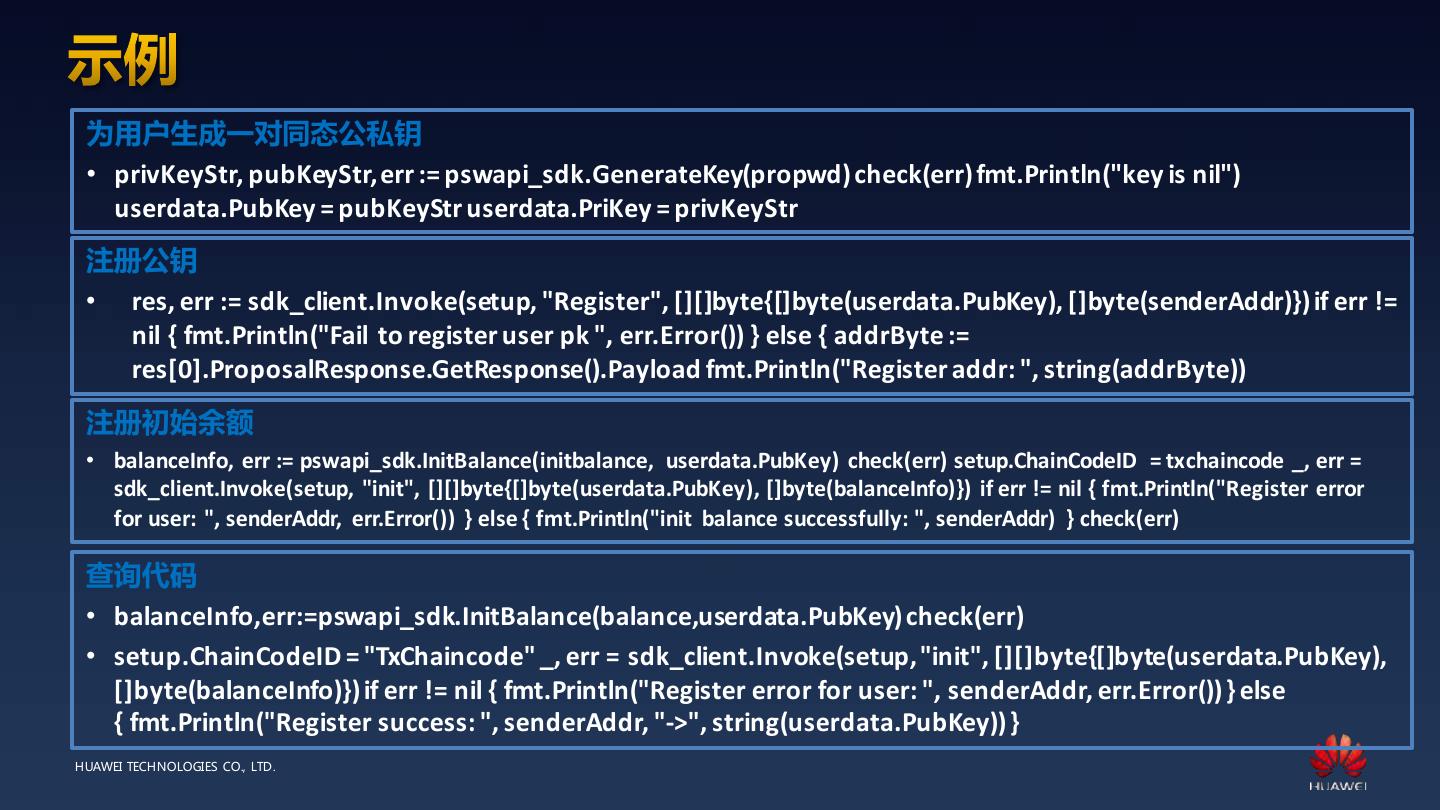 16 . 为用户生成一对同态公私钥 • privKeyStr, pubKeyStr, err := pswapi_sdk.GenerateKey(propwd) check(err) fmt.Println("key is nil") userdata.PubKey = pubKeyStr userdata.PriKey = privKeyStr 注册公钥 • res, err := sdk_client.Invoke(setup, "Register", [][]byte{[]byte(userdata.PubKey), []byte(senderAddr)}) if err != nil { fmt.Println("Fail to register user pk ", err.Error()) } else { addrByte := res[0].ProposalResponse.GetResponse().Payload fmt.Println("Register addr: ", string(addrByte)) 注册初始余额 • balanceInfo, err := pswapi_sdk.InitBalance(initbalance, userdata.PubKey) check(err) setup.ChainCodeID = txchaincode _, err = sdk_client.Invoke(setup, "init", [][]byte{[]byte(userdata.PubKey), []byte(balanceInfo)}) if err != nil { fmt.Println("Register error for user: ", senderAddr, err.Error()) } else { fmt.Println("init balance successfully: ", senderAddr) } check(err) 查询代码 • balanceInfo,err:=pswapi_sdk.InitBalance(balance,userdata.PubKey) check(err) • setup.ChainCodeID = "TxChaincode" _, err = sdk_client.Invoke(setup, "init", [][]byte{[]byte(userdata.PubKey), []byte(balanceInfo)}) if err != nil { fmt.Println("Register error for user: ", senderAddr, err.Error()) } else { fmt.Println("Register success: ", senderAddr, "->", string(userdata.PubKey)) } HUAWEI TECHNOLOGIES CO., LTD.