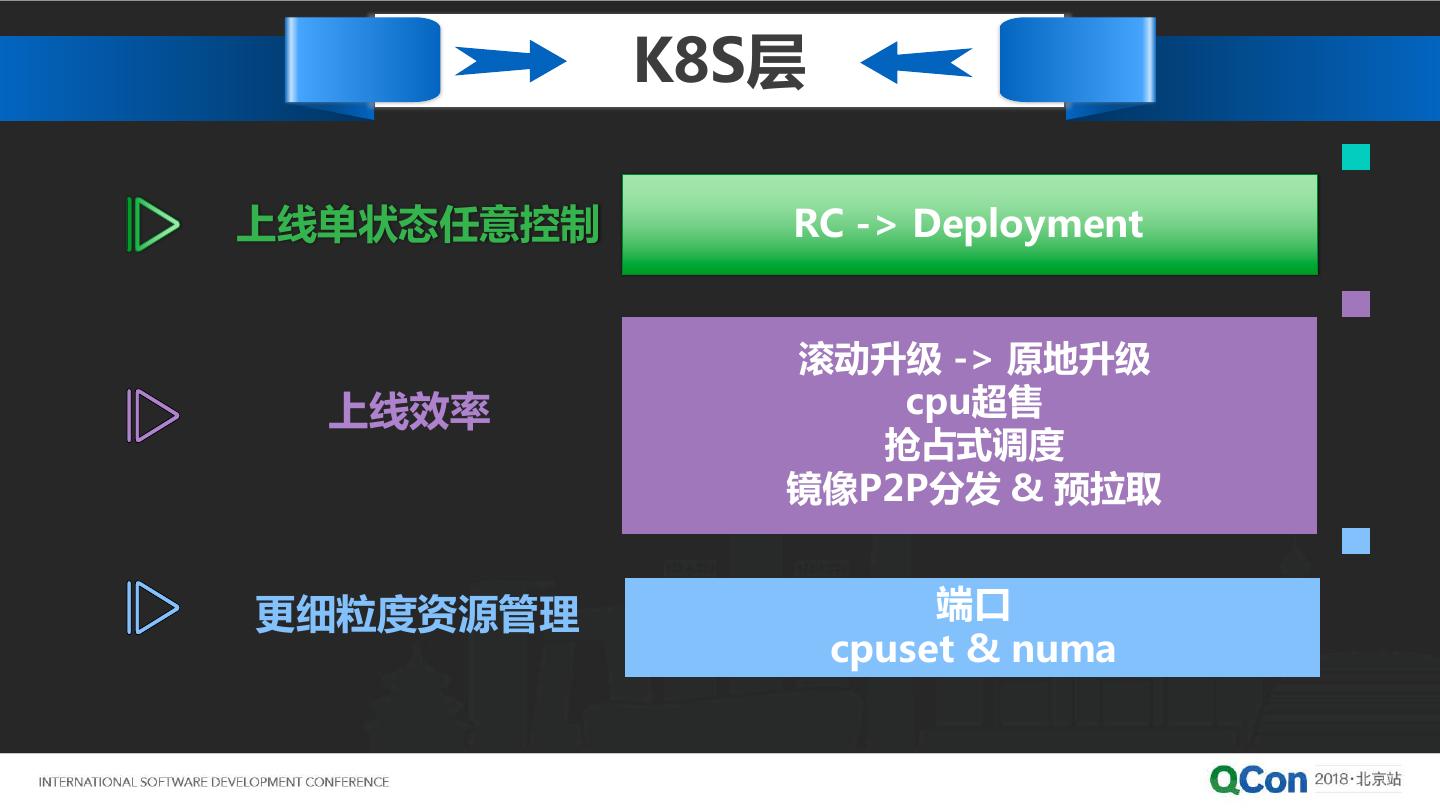 13 . K8S层 上线单状态任意控制 RC -> Deployment 滚动升级 -> 原地升级 上线效率 cpu超售 抢占式调度 镜像P2P分发 & 预拉取 更细粒度资源管理 端口 cpuset & numa