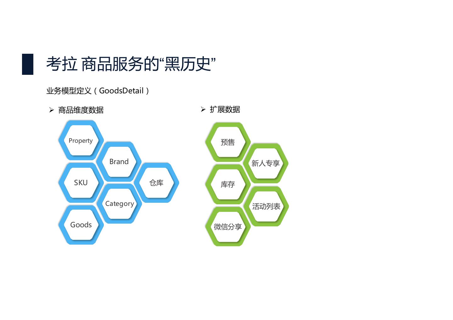 19 .重新定义数据模型 Ø 目标2:支持高效的使用和针对性的优化 按业务维度的来定义数据模型 u 商品基本数据 u 商品扩展数据 u 商品动态数据 u 商品附属数据 Property Brand 当前 售价 商品 SKU Category 标签 可售 库存 Goods 仓库