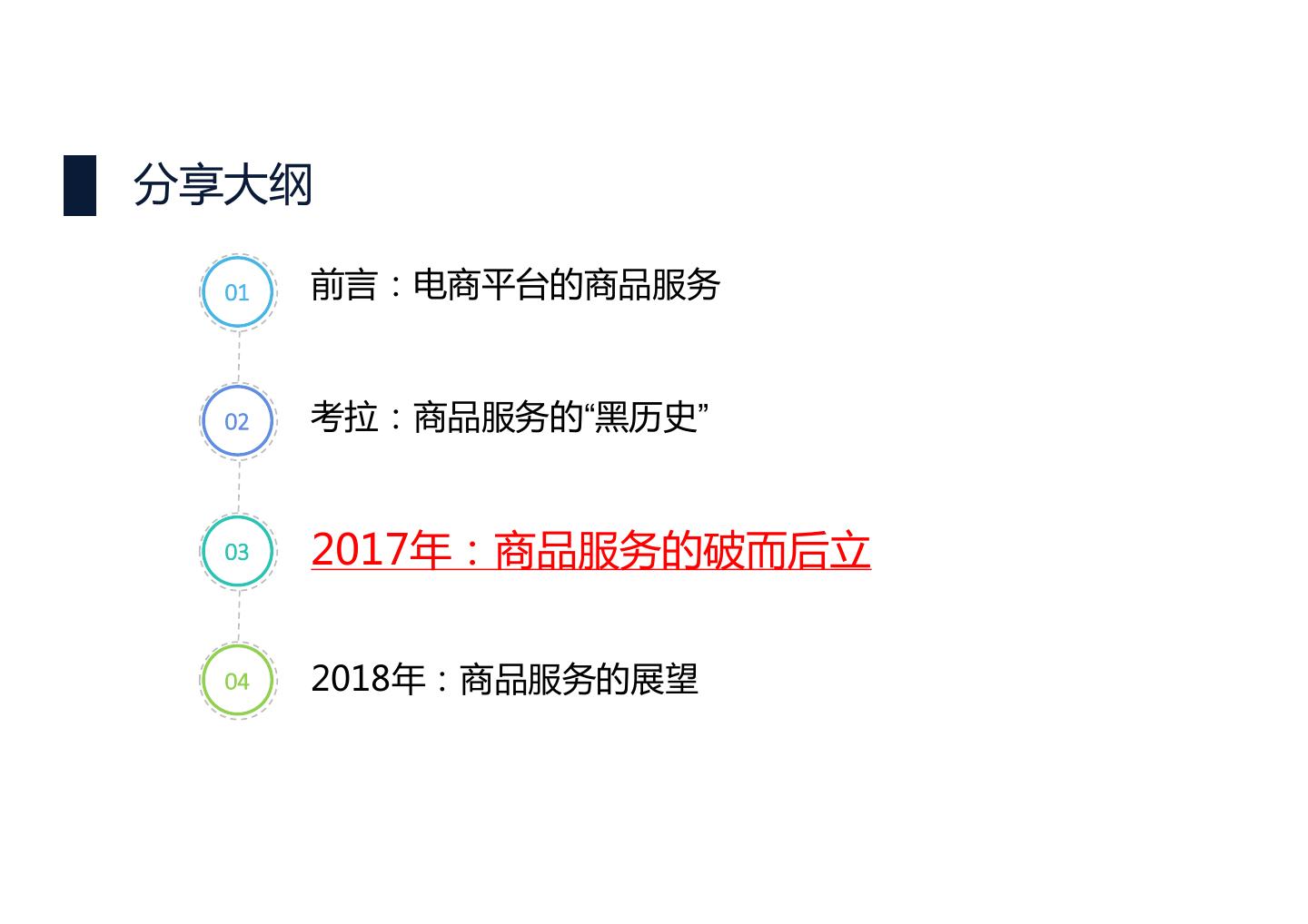 13 .分享大纲 01 前言:电商平台的商品服务 02 考拉:商品服务的“黑历史” 03 2017年:商品服务的破而后立 04 2018年:商品服务的展望