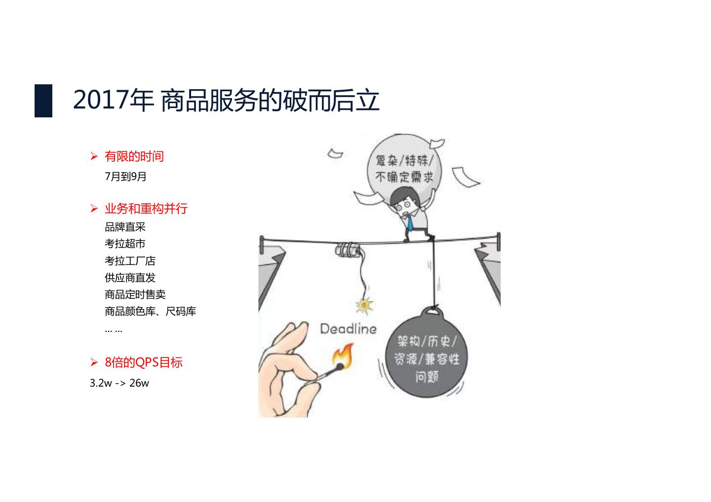 14 .2017年 商品服务的破而后立 Ø 有限的时间 7月到9月 Ø 业务和重构并行 品牌直采 考拉超市 考拉工厂店 供应商直发 商品定时售卖 商品颜色库、尺码库 ... ... Ø 8倍的QPS目标 3.2w -> 26w