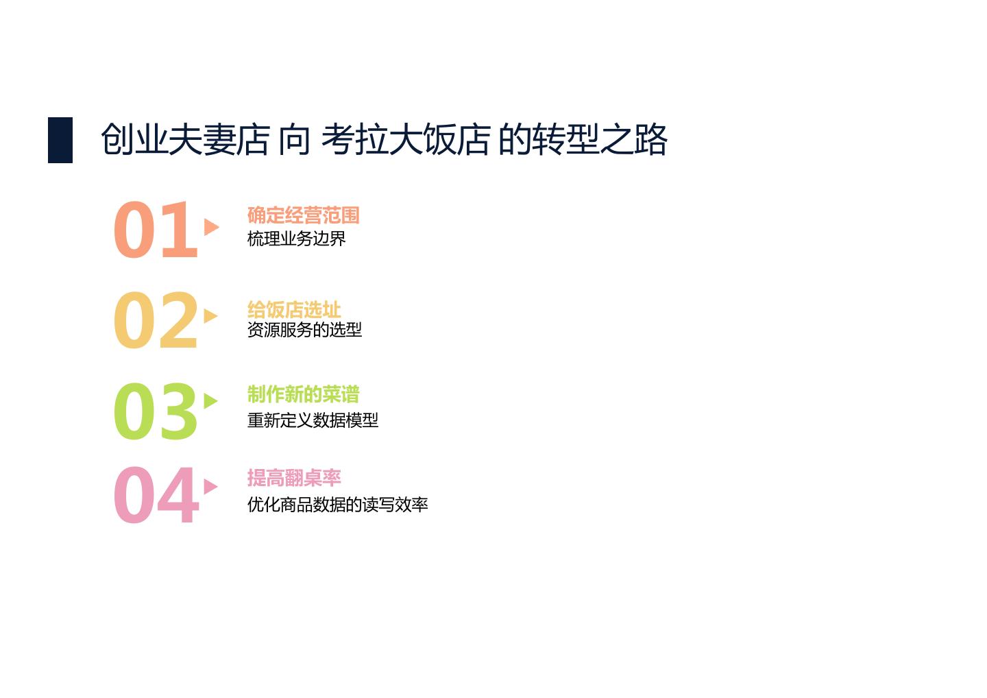 15 .创业夫妻店 向 考拉大饭店 的转型之路 01 确定经营范围 梳理业务边界 02 给饭店选址 资源服务的选型 03 制作新的菜谱 重新定义数据模型 04 提高翻桌率 优化商品数据的读写效率