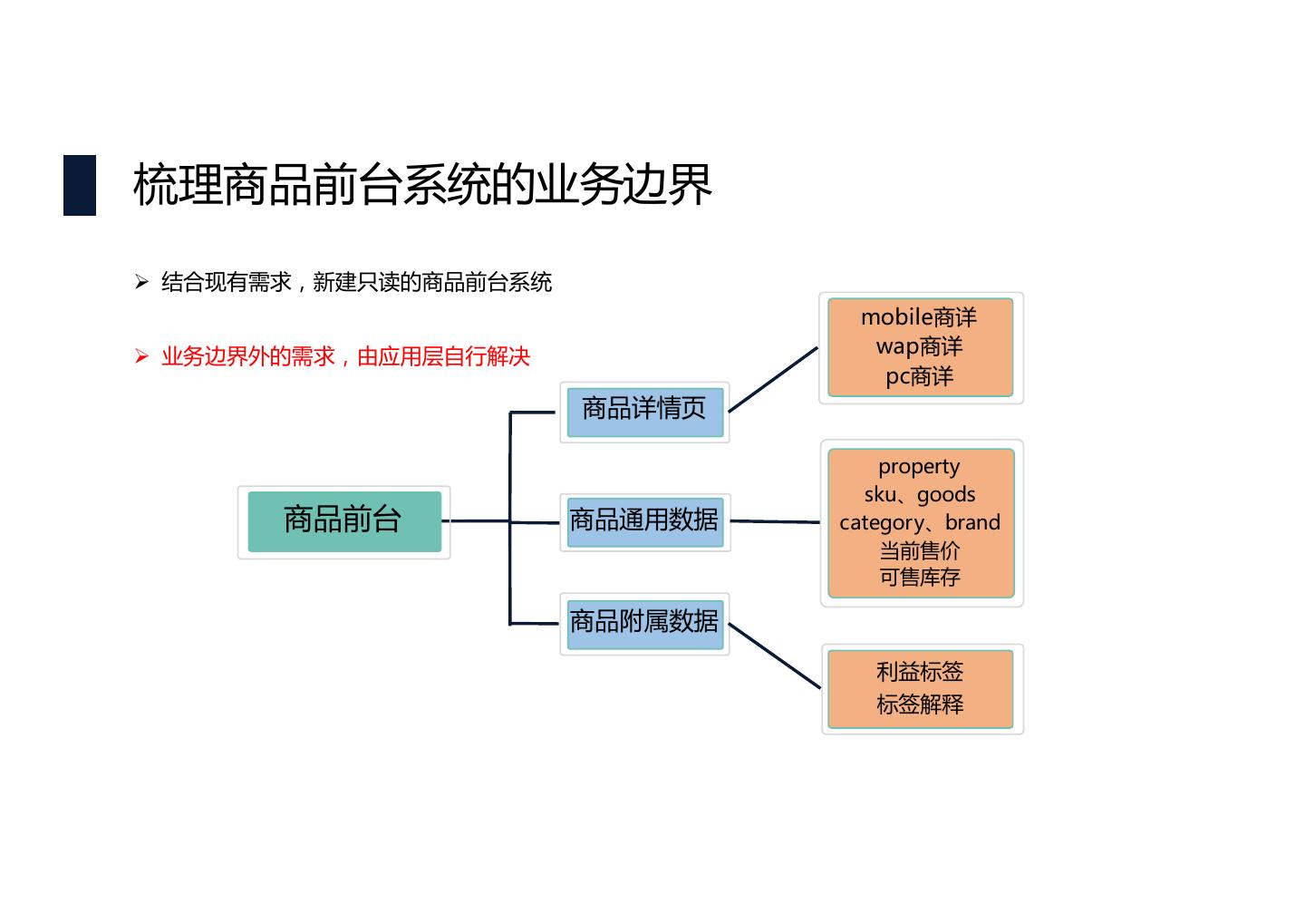 16 .梳理商品前台系统的业务边界 Ø 结合现有需求,新建只读的商品前台系统 mobile商详 Ø 业务边界外的需求,由应用层自行解决 wap商详 pc商详 商品详情页 property sku、goods 商品前台 商品通用数据 category、brand 当前售价 可售库存 商品附属数据 利益标签 标签解释