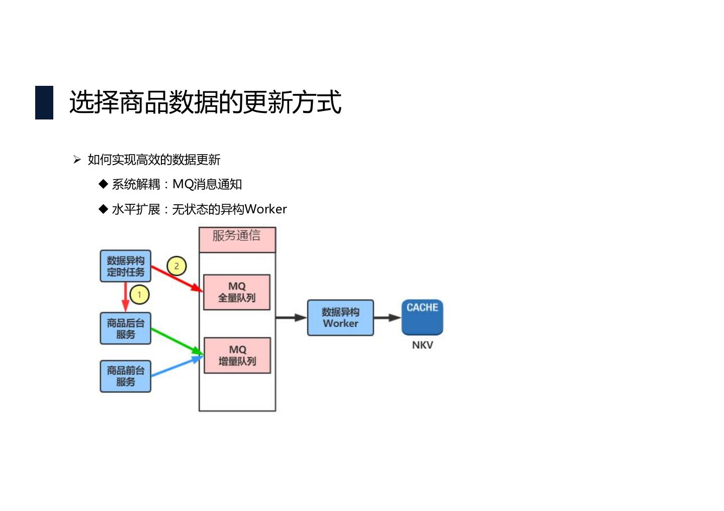 21 .选择商品数据的更新方式 Ø 如何实现高效的数据更新 u 系统解耦:MQ消息通知 u 水平扩展:无状态的异构Worker