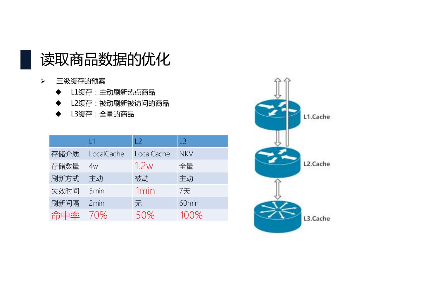 22 .读取商品数据的优化 Ø 三级缓存的预案 u L1缓存:主动刷新热点商品 u L2缓存:被动刷新被访问的商品 u L3缓存:全量的商品 L1 L2 L3 存储介质 LocalCache LocalCache NKV 存储数量 4w 1.2w 全量 刷新方式 主动 被动 主动 失效时间 5min 1min 7天 刷新间隔 2min 无 60min 命中率 70% 50% 100%