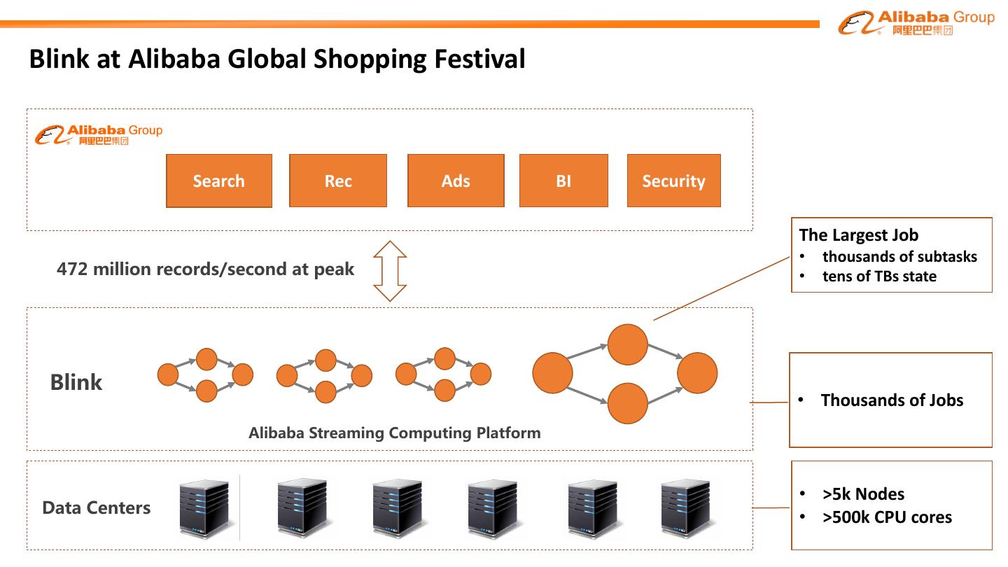 9 .Blink at Alibaba Global Shopping Festival Search Rec Ads BI Security The Largest Job • thousands of subtasks // 2 4 24 2 • tens of TBs state / • Thousands of Jobs / 4 2 7 / 24 • >5k Nodes 4 • >500k CPU cores