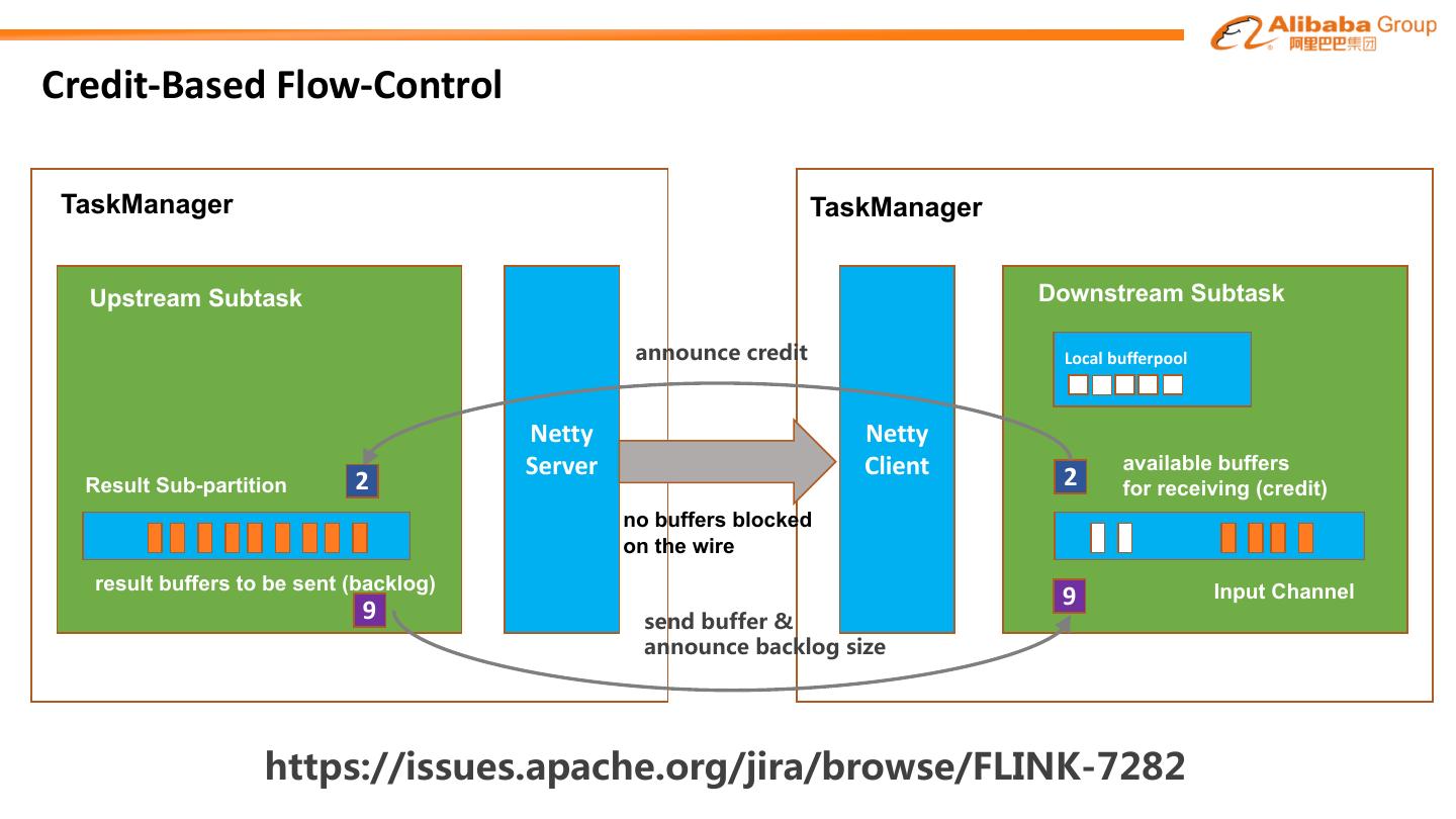 14 .Credit-Based Flow-Control TaskManager TaskManager Upstream Subtask Downstream Subtask : 7 Local bufferpool Netty Netty Server Client 2 available buffers Result Sub-partition 2 for receiving (credit) no buffers blocked on the wire result buffers to be sent (backlog) 9 Input Channel 9 8 :-- 7 : 2 .8 / 8 88: 8 / 7. 7 7 8 &
