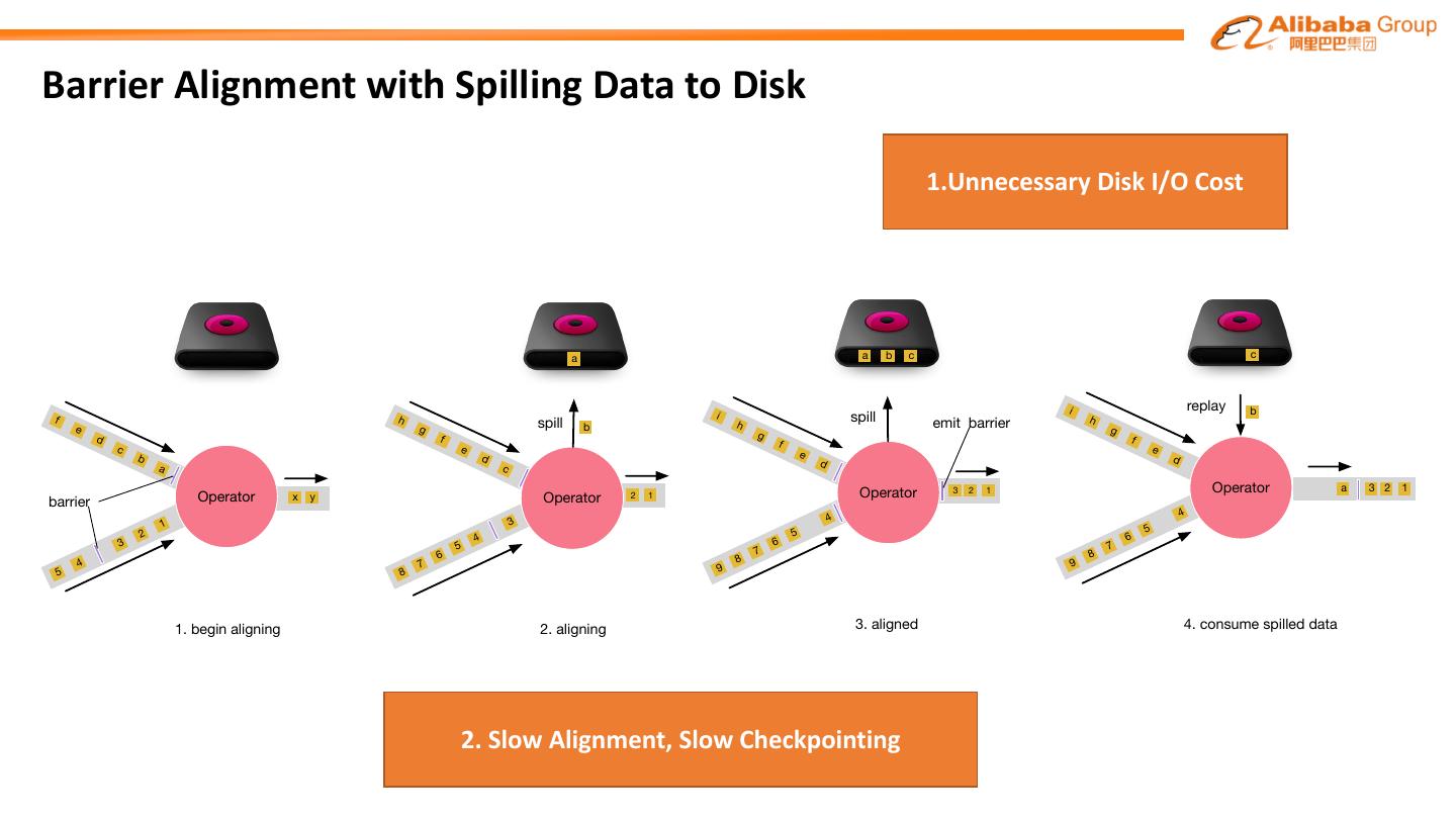 15 .Barrier Alignment with Spilling Data to Disk 1.Unnecessary Disk I/O Cost a a b c c i replay b f h spill i h spill emit barrier h e g b g d f g f c e f e b d e d a c d Operator 3 2 1 Operator a 3 2 1 barrier Operator x y Operator 2 1 4 4 1 3 2 5 5 4 6 6 3 5 7 6 7 8 4 7 8 9 5 8 9 1. begin aligning 2. aligning 3. aligned 4. consume spilled data 2. Slow Alignment, Slow Checkpointing