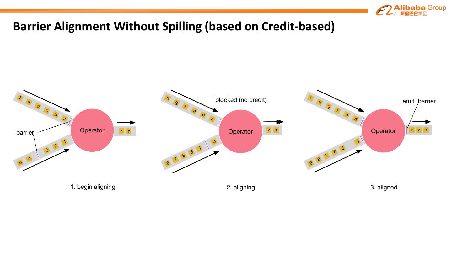 16 .Barrier Alignment Without Spilling (based on Credit-based) f h i e g blocked (no credit) h emit barrier d f g c e f b d e a c d barrier Operator x y Operator 22 11 Operator 3 2 1 1 3 4 2 5 3 4 5 6 6 7 4 7 8 5 8 9 1. begin aligning 2. aligning 3. aligned