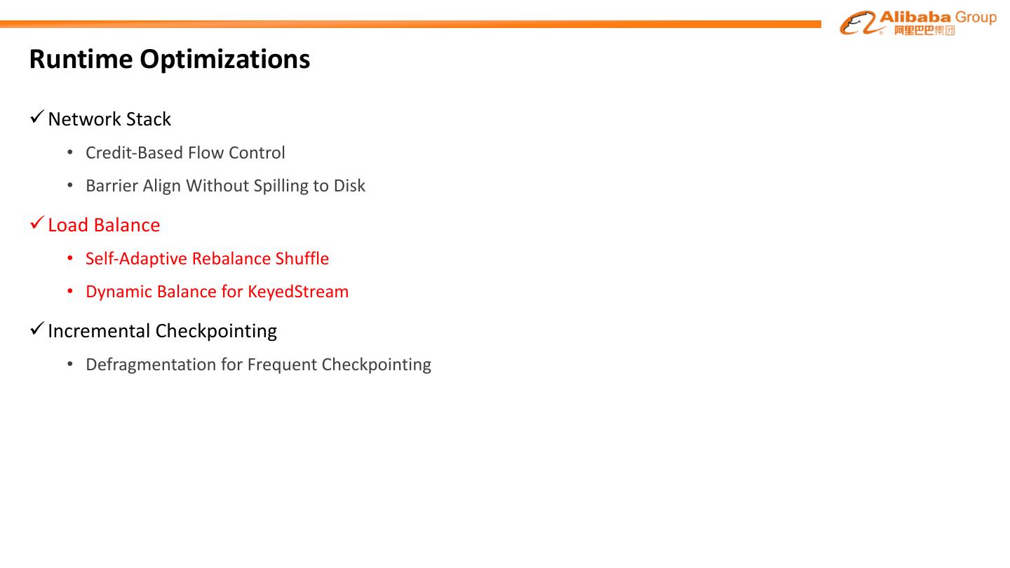 12 .Runtime Optimizations ü Network Stack • Credit-Based Flow Control • Barrier Align Without Spilling to Disk ü Load Balance • Self-Adaptive Rebalance Shuffle • Dynamic Balance for KeyedStream ü Incremental Checkpointing • Defragmentation for Frequent Checkpointing