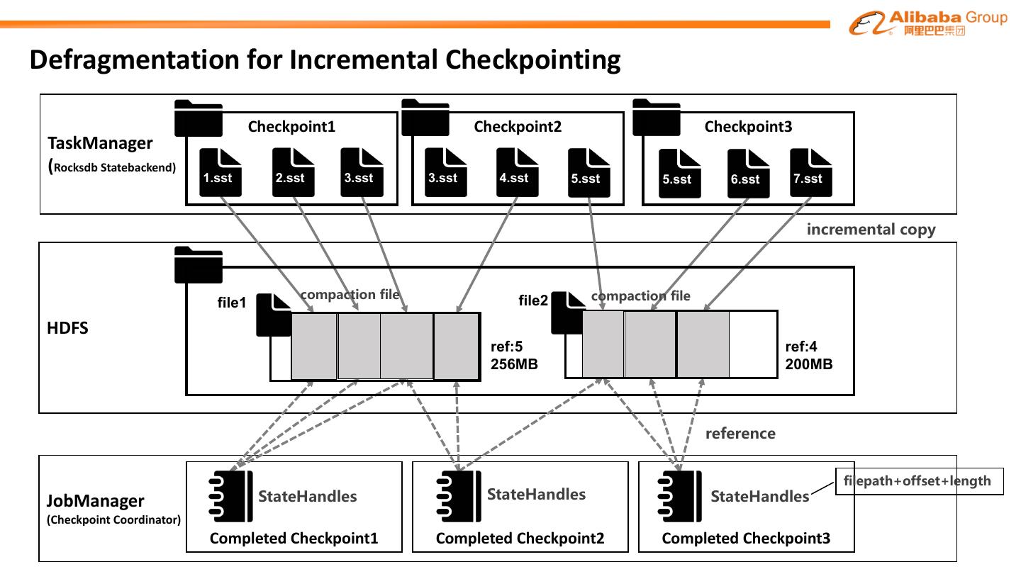 29 .File Fragmentation caused by Incremental Checkpointing Checkpoint1 Checkpoint2 Checkpoint3 TaskManager more frequent (Rocksdb Statebackend) 1.sst 2.sst 3.sst 3.sst 4.sst 5.sst 5.sst 6.sst 7.sst HDFS 3.sst ref:2 4.sst 5.sst ref:2 7.sst ref:1 more small files 1.sst 2.sst ref:1 ref:1 6.sst ref:1 ref:1 2MB 2MB 5MB 8MB 1MB 4MB 1MB JobManager (Checkpoint Coordinator) Completed Checkpoint1 Completed Checkpoint2 Completed Checkpoint3
