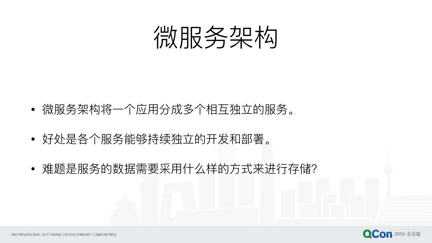 4 . 微服务架构 • 微服务架构将⼀一个应⽤用分成多个相互独⽴立的服务。 • 好处是各个服务能够持续独⽴立的开发和部署。 • 难题是服务的数据需要采⽤用什什么样的⽅方式来进⾏行行存储?