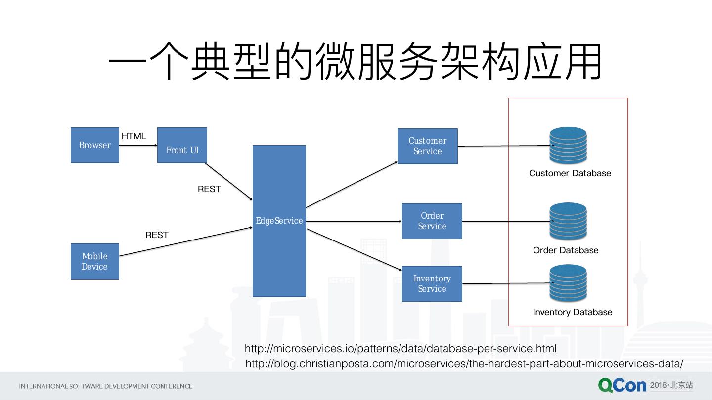 6 . ⼀一个典型的微服务架构应⽤用 HTML Customer Browser Front UI Service Customer Database REST Order EdgeService Service REST Order Database Mobile Device Inventory Service Inventory Database http://microservices.io/patterns/data/database-per-service.html http://blog.christianposta.com/microservices/the-hardest-part-about-microservices-data/