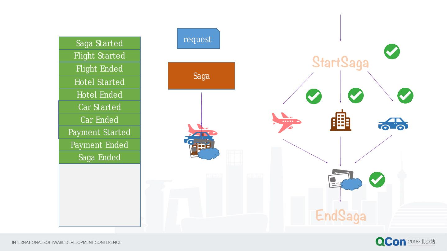 14 . Saga Started request StartSaga Flight Started Flight Ended Saga Hotel Started Hotel Ended Car Started Car Ended Payment Started Payment Ended Saga Ended EndSaga
