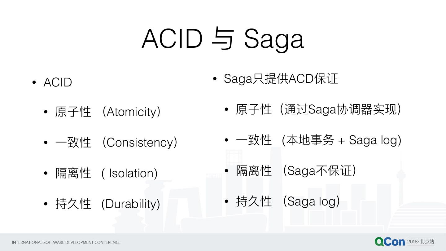 18 . ACID 与 Saga • ACID • Saga只提供ACD保证 • 原⼦子性 (Atomicity) • 原⼦子性(通过Saga协调器器实现) • ⼀一致性 (Consistency) • ⼀一致性 (本地事务 + Saga log) • 隔离性 ( Isolation) • 隔离性 (Saga不不保证) • 持久性 (Durability) • 持久性 (Saga log)