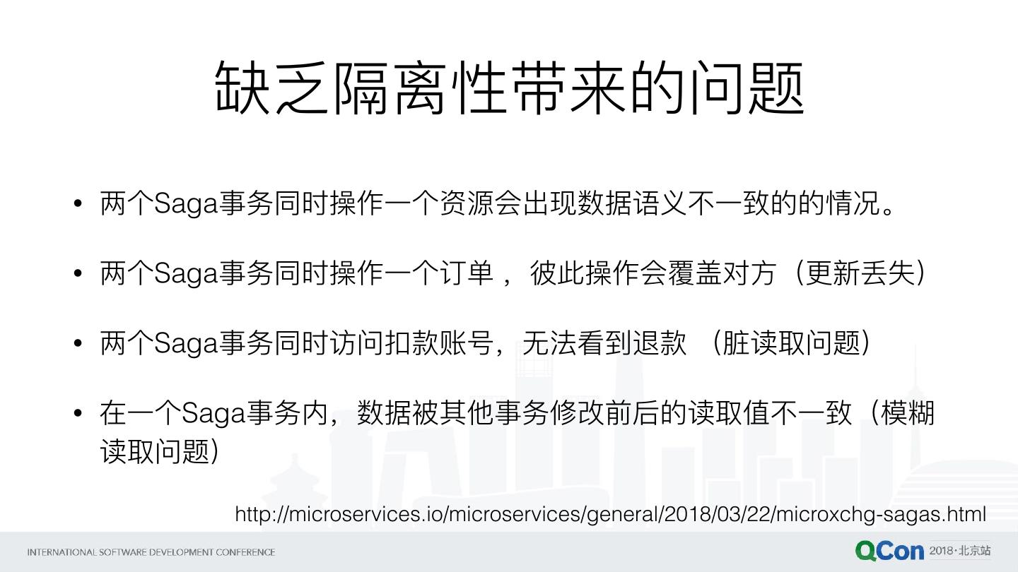 19 . 缺乏隔离性带来的问题 • 两个Saga事务同时操作⼀一个资源会出现数据语义不不⼀一致的的情况。 • 两个Saga事务同时操作⼀一个订单 ,彼此操作会覆盖对⽅方(更更新丢失) • 两个Saga事务同时访问扣款账号,⽆无法看到退款 (脏读取问题) • 在⼀一个Saga事务内,数据被其他事务修改前后的读取值不不⼀一致(模糊 读取问题) http://microservices.io/microservices/general/2018/03/22/microxchg-sagas.html