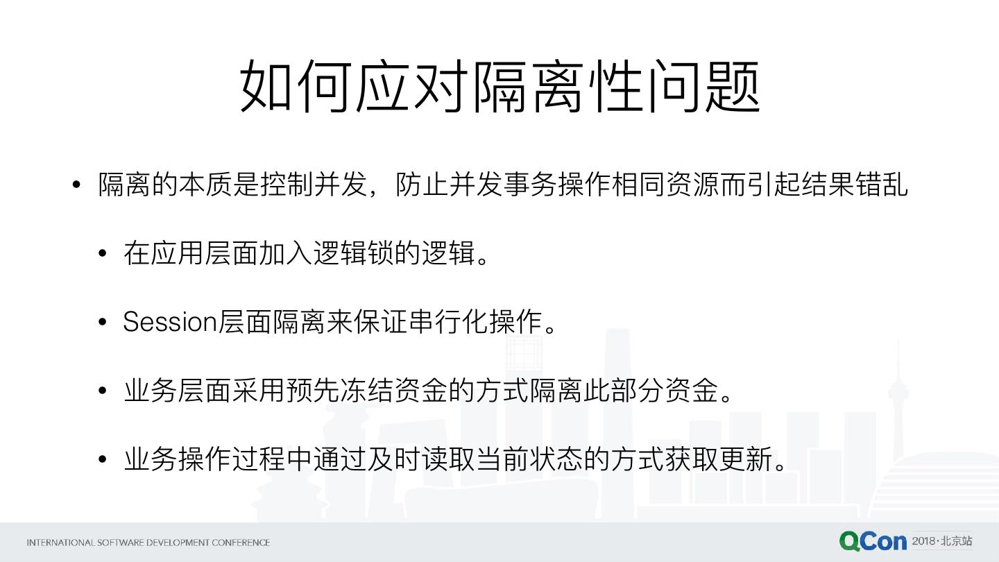 20 . 如何应对隔离性问题 • 隔离的本质是控制并发,防⽌止并发事务操作相同资源⽽而引起结果错乱 • 在应⽤用层⾯面加⼊入逻辑锁的逻辑。 • Session层⾯面隔离来保证串串⾏行行化操作。 • 业务层⾯面采⽤用预先冻结资⾦金金的⽅方式隔离此部分资⾦金金。 • 业务操作过程中通过及时读取当前状态的⽅方式获取更更新。