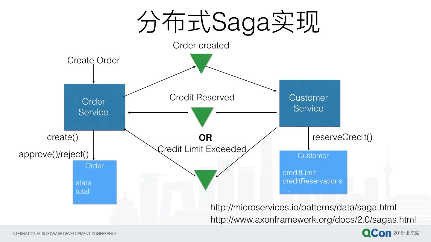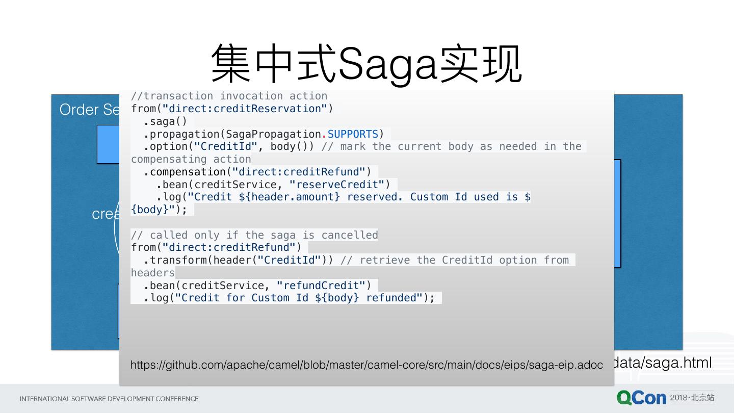 22 . 集中式Saga实现 //transaction invocation action Order from("direct:creditReservation") Service Customer Service .saga() .propagation(SagaPropagation.SUPPORTS) OrderService .option("CreditId", body()) // mark the current body as needed in the compensating action .compensation("direct:creditRefund") CustomerService create() .bean(creditService, "reserveCredit") reserveCredit() .log("Credit ${header.amount} reserved. Custom Id used is $ creditLimit {body}"); create() CreateOrder Saga // called only creditReserved() if the saga is cancelled from("direct:creditRefund") creditReservate … option from .transform(header("CreditId")) // retrieve the CreditId headers .bean(creditService, "refundCredit") .log("Credit Order for Custom Id ${body} refunded"); state total … http://microservices.io/patterns/data/saga.html https://github.com/apache/camel/blob/master/camel-core/src/main/docs/eips/saga-eip.adoc