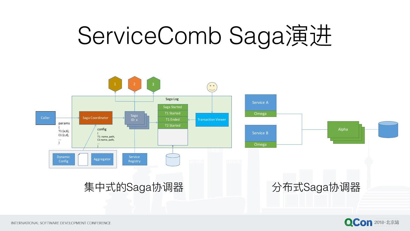25 . ServiceComb Saga演进 1 2 3 Saga Log Service A Saga Started Saga T1 Started Omega Caller Saga Coordinator Transaction Viewer Saga ID: x T1 Ended params Saga { T2 Started T1:[a,b], config Alpha { Service B Alpha C1:[c,d], T1: name, path, Alpha ... C1:name, path, } ... } Omega Dynamic Service Aggregator Config Registry 集中式的Saga协调器器 分布式Saga协调器器