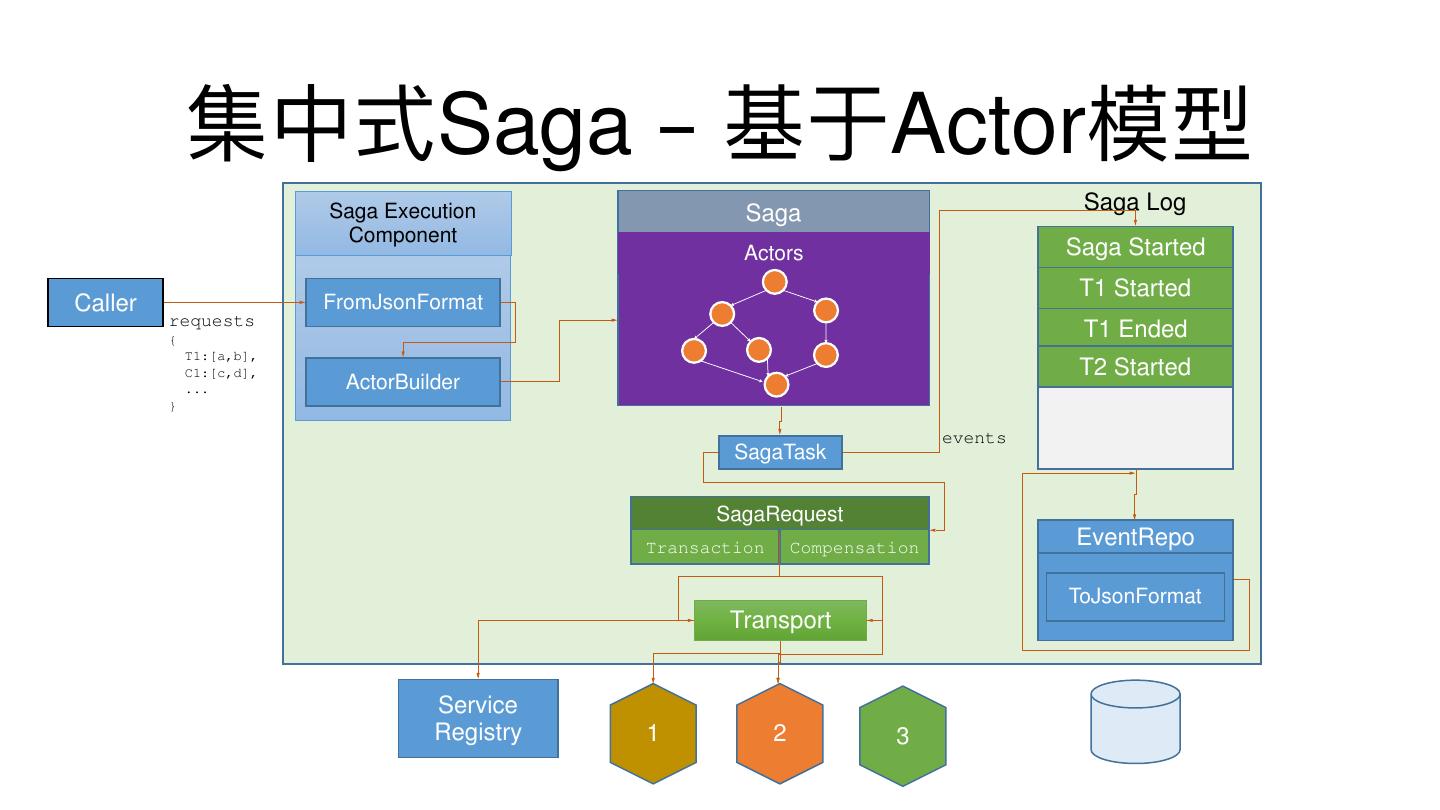 28 . 集中式Saga – 基于Actor模型 Saga Execution Saga Saga Log Component Actors Saga Started T1 Started Caller FromJsonFormat requests { T1 Ended T1:[a,b], C1:[c,d], T2 Started ... ActorBuilder } events SagaTask SagaRequest Transaction Compensation EventRepo ToJsonFormat Transport Service Registry 1 2 3