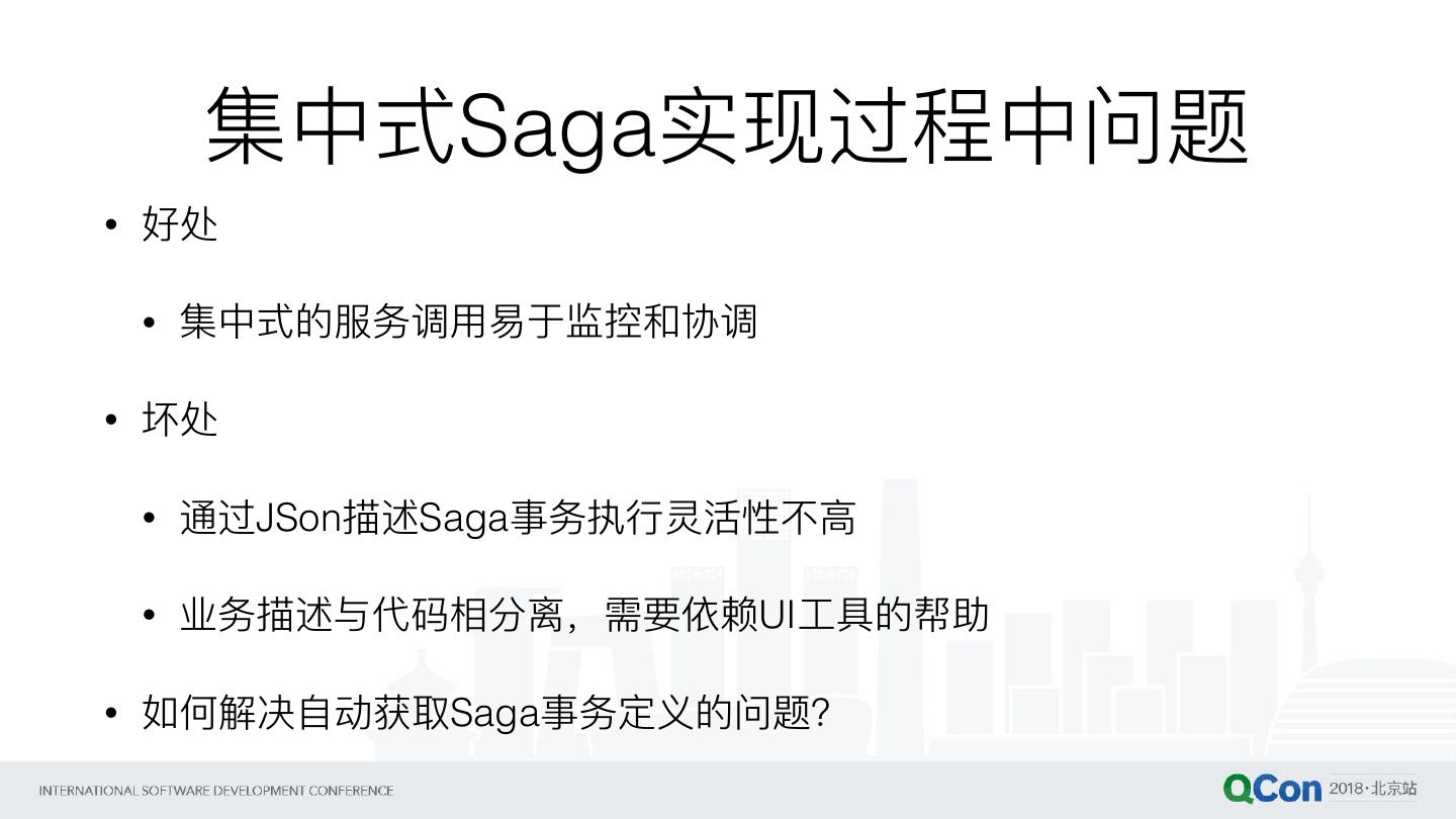 29 . 集中式Saga实现过程中问题 • 好处 • 集中式的服务调⽤用易易于监控和协调 • 坏处 • 通过JSon描述Saga事务执⾏行行灵活性不不⾼高 • 业务描述与代码相分离,需要依赖UI⼯工具的帮助 • 如何解决⾃自动获取Saga事务定义的问题?