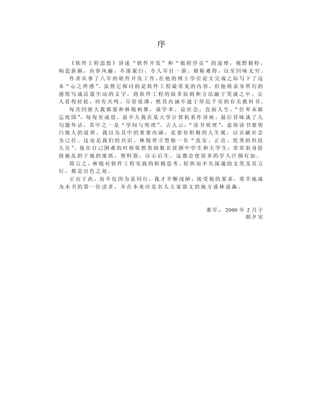 2 . 序 《软件工程思想》讲述“软件开发”和“做程序员”的道理,视野独特, 构 思 新 颖 ,内 容 风 趣 ,不 落 窠 臼 ,令 人 耳 目 一 新 。堪 称 难 得 ,以 至 回 味 无 穷 。 作 者 从 事 了 八 年 的 软 件 开 发 工 作 ,在 他 的 博 士 学 位 论 文 完 成 之 际 写 下 了 这 本“ 心 之 所 感 ”。虽 然 它 探 讨 的 是 软 件 工 程 最 常 见 的 内 容 ,但 他 将 亲 身 所 历 的 感悟写成活泼生动的文字,将软件工程的很多原则和方法融于笑谈之中,让 人 看 得 轻 松 ,时 有 共 鸣 。尽 管 很 薄 ,然 其 内 涵 不 逊 于 厚 近 千 页 的 有 关 教 科 书 。 每 次 回 浙 大 我 都 要 和 林 锐 相 聚 , 谈 学 术 、 论 社 会 , 直 面 人 生 ,“ 位 卑 未 敢 忘 忧 国 ”,每 每 至 凌 晨 。前 不 久 我 在 某 大 学 计 算 机 系 作 讲 座 ,最 后 冒 昧 谈 了 几 句 题 外 话 , 其 中 之 一 是 “ 学 问 与 明 理 ”。 古 人 云 :“ 读 书 明 理 ”, 意 即 读 书 要 明 白做人的道理。我以为其中的重要内涵,是要有积极的人生观,以贡献社会 为己任。这也是我们的共识。林锐曾立誓做一名“真实、正直、优秀的科技 人 员 ”。他 在 自 己 困 难 的 时 候 依 然 资 助 数 名 贫 困 中 学 生 和 大 学 生 ;常 常 躬 身 拾 捡被乱扔于地的废纸、塑料袋,以示后生。这都会使很多的学人汗颜有加。 简 言 之 ,林 锐 对 软 件 工 程 实 践 的 积 极 思 考 、轻 快 而 不 失 深 邃 的 文 笔 及 其 言 行,都是出色之处。 正 由 于 此 ,而 不 仅 因 为 是 同 行 ,我 才 不 惭 浅 陋 ,接 受 他 的 要 求 ,荣 幸 地 成 为本书的第一位读者,并在本来应是名人大家留文的地方谈林说森。 董 军 , 20 00 年 2 月 于 朝夕室