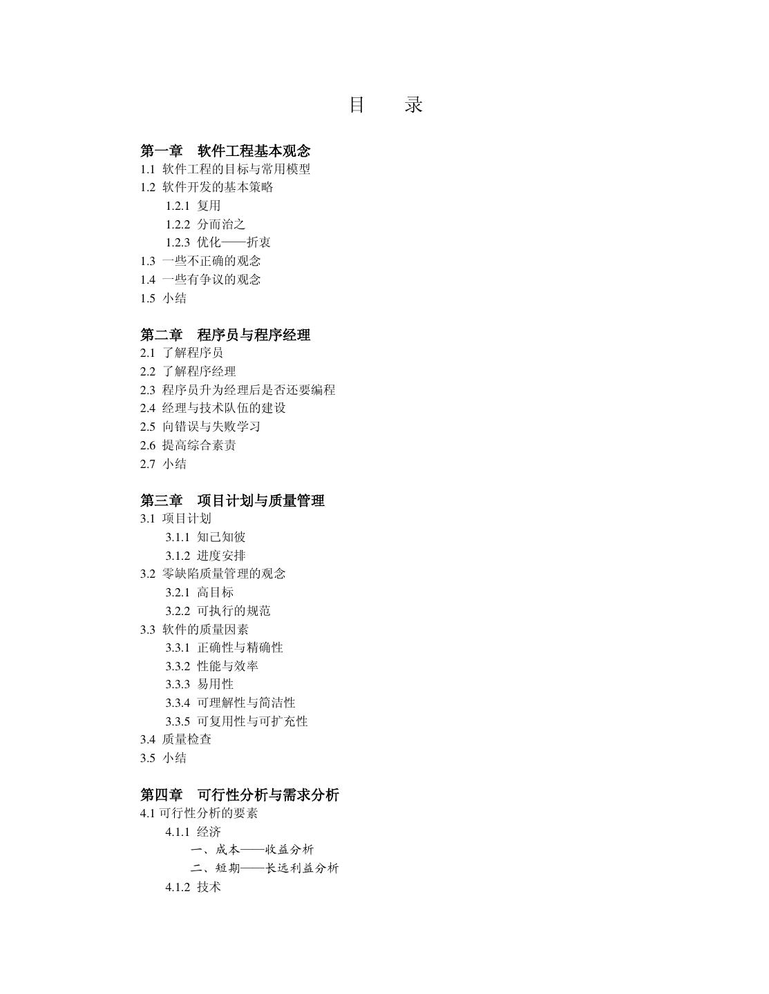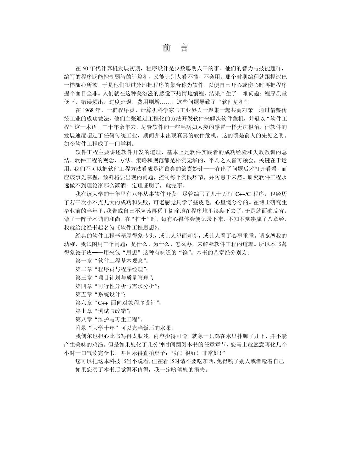 3 . 前 言 在 60 年代计算机发展初期,程序设计是少数聪明人干的事。他们的智力与技能超群, 编写的程序既能控制弱智的计算机,又能让别人看不懂、不会用。那个时期编程就跟捏泥巴 一样随心所欲,于是他们很过分地把程序的集合称为软件,以便自己开心或伤心时再把程序 捏个面目全非。人们就在这种美滋滋的感觉下热情地编程,结果产生了一堆问题:程序质量 低下,错误频出,进度延误,费用剧增……。这些问题导致了“软件危机” 。 在 1968 年,一群程序员、计算机科学家与工业界人士聚集一起共商对策。通过借鉴传 统工业的成功做法,他们主张通过工程化的方法开发软件来解决软件危机,并冠以“软件工 程”这一术语。三十年余年来,尽管软件的一些毛病如人类的感冒一样无法根治,但软件的 发展速度超过了任何传统工业,期间并未出现真真的软件危机。这的确是前人的先见之明。 如今软件工程成了一门学科。 软件工程主要讲述软件开发的道理,基本上是软件实践者的成功经验和失败教训的总 结。软件工程的观念、方法、策略和规范都是朴实无华的,平凡之人皆可领会,关键在于运 用。我们不可以把软件工程方法看成是诸葛亮的锦囊妙计─—在出了问题后才打开看看,而 应该事先掌握,预料将要出现的问题,控制每个实践环节,并防患于未然。研究软件工程永 远做不到理论家那么潇洒:定理证明了,就完事。 我在读大学的十年里有八年从事软件开发,尽管编写了几十万行 C++/C 程序,也经历 了若干次小不点儿大的成功和失败,可老感觉只学了些皮毛,心里慌兮兮的。在博士研究生 毕业前的半年里,我告戒自己不应该再稀里糊涂地在程序堆里滚爬下去了,于是就面壁反省, 做了一阵子木讷的和尚。在“打坐”时,每有心得体会便记录下来,不知不觉凑成了八章经, 我就给此经书起名为《软件工程思想》。 经典的软件工程书籍厚得象砖头,或让人望而却步,或让人看了心事重重。请宽恕我的 幼稚,我试图用三个问题:是什么、为什么、怎么办,来解释软件工程的道理。所以本书薄 得象饺子皮─—用来包“思想”这种有味道的“馅”。本书的八章经分别为: 第一章“软件工程基本观念”; 第二章“程序员与程序经理”; 第三章“项目计划与质量管理”; 第四章“可行性分析与需求分析”; 第五章“系统设计” ; 第六章“C++ 面向对象程序设计”; 第七章“测试与改错” ; 第八章“维护与再生工程” 。 附录“大学十年”可以充当饭后的水果。 我偶尔也担心此书写得太肤浅,内容少得可怜。就象一只鸡在水里扑腾了几下,并不能 产生美味的鸡汤。但是如果您化了几分钟时间翻阅本书的任意章节,您马上就愿意再化几个 小时一口气读完全书,并且乐得直拍桌子: “好!很好!非常好! ” 您可以把这本科技书当小说看,但在看书时请不要吃东西,免得喷了别人或者呛着自己。 如果您买了本书后觉得不值得,我一定赔偿您的损失。