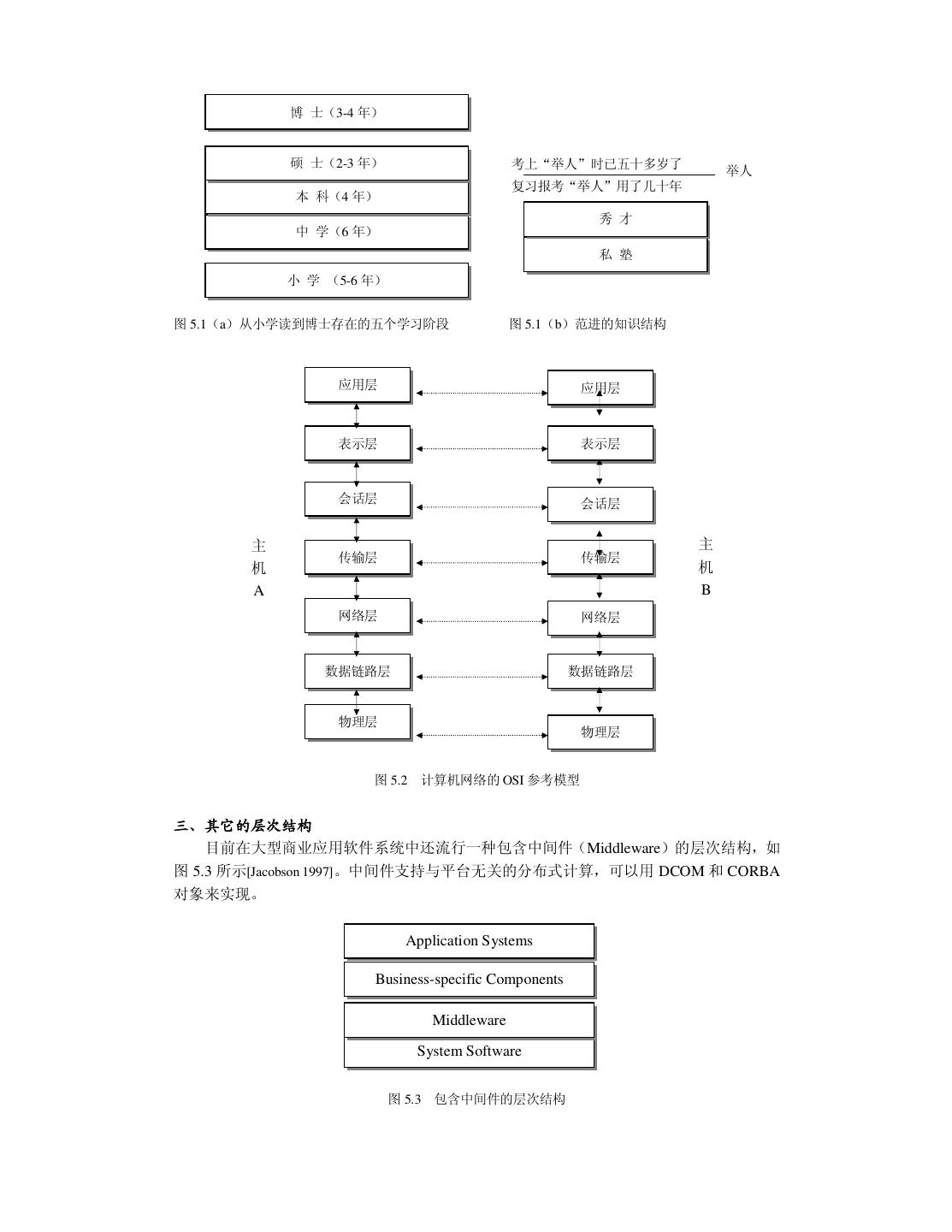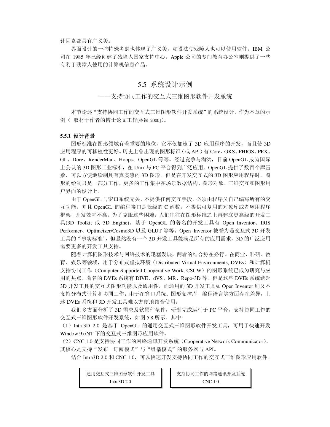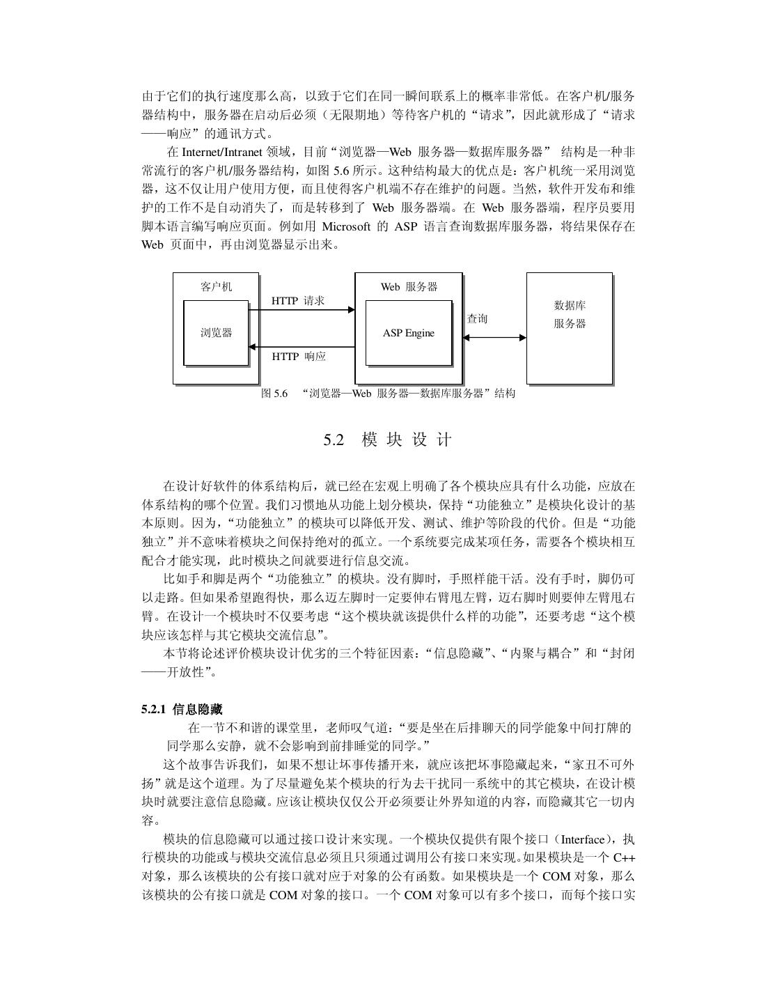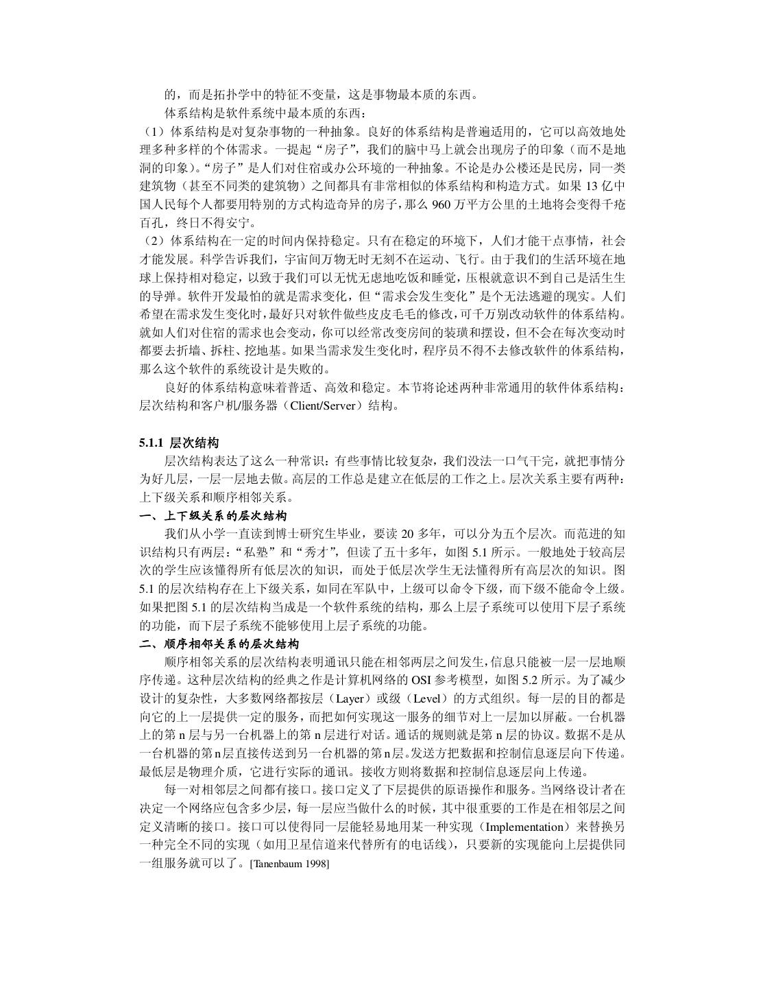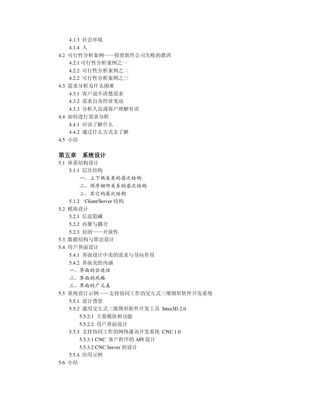 6 . 4.1.3 社会环境 4.1.4 人 4.2 可行性分析案例——投资软件公司失败的教训 4.2.1 可行性分析案例之一 4.2.2 可行性分析案例之二 4.2.2 可行性分析案例之三 4.3 需求分析为什么困难 4.3.1 客户说不清楚需求 4.3.2 需求自身经常变动 4.3.3 分析人员或客户理解有误 4.4 如何进行需求分析 4.4.1 应该了解什么 4.4.2 通过什么方式去了解 4.5 小结 第五章 系统设计 5.1 体系结构设计 5.1.1 层次结构 一、上下级关系的层次结构 二、顺序相邻关系的层次结构 三、其它的层次结构 5.1.2 Client/Server 结构 5.2 模块设计 5.2.1 信息隐藏 5.2.2 内聚与耦合 5.2.3 封闭——开放性 5.3 数据结构与算法设计 5.4 用户界面设计 5.4.1 界面设计中美的需求与导向作用 5.4.2 界面美的内涵 一、界面的合适性 二、界面的风格 三、界面的广义美 5.5 系统设计示例——支持协同工作的交互式三维图形软件开发系统 5.5.1 设计背景 5.5.2 通用交互式三维图形软件开发工具 Intra3D 2.0 5.5.2.1 主要模块和功能 5.5.2.2 用户界面设计 5.5.3 支持协同工作的网络通讯开发系统 CNC 1.0 5.5.3.1 CNC 客户程序的 API 设计 5.5.3.2 CNC Server 的设计 5.5.4 应用示例 5.6 小结