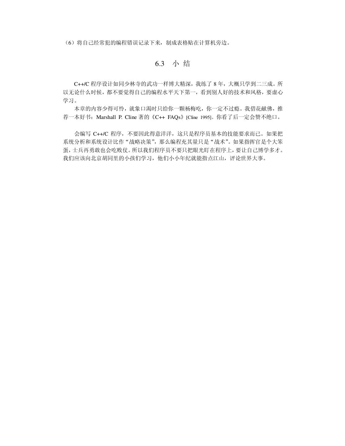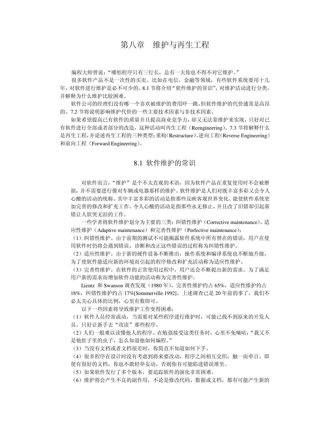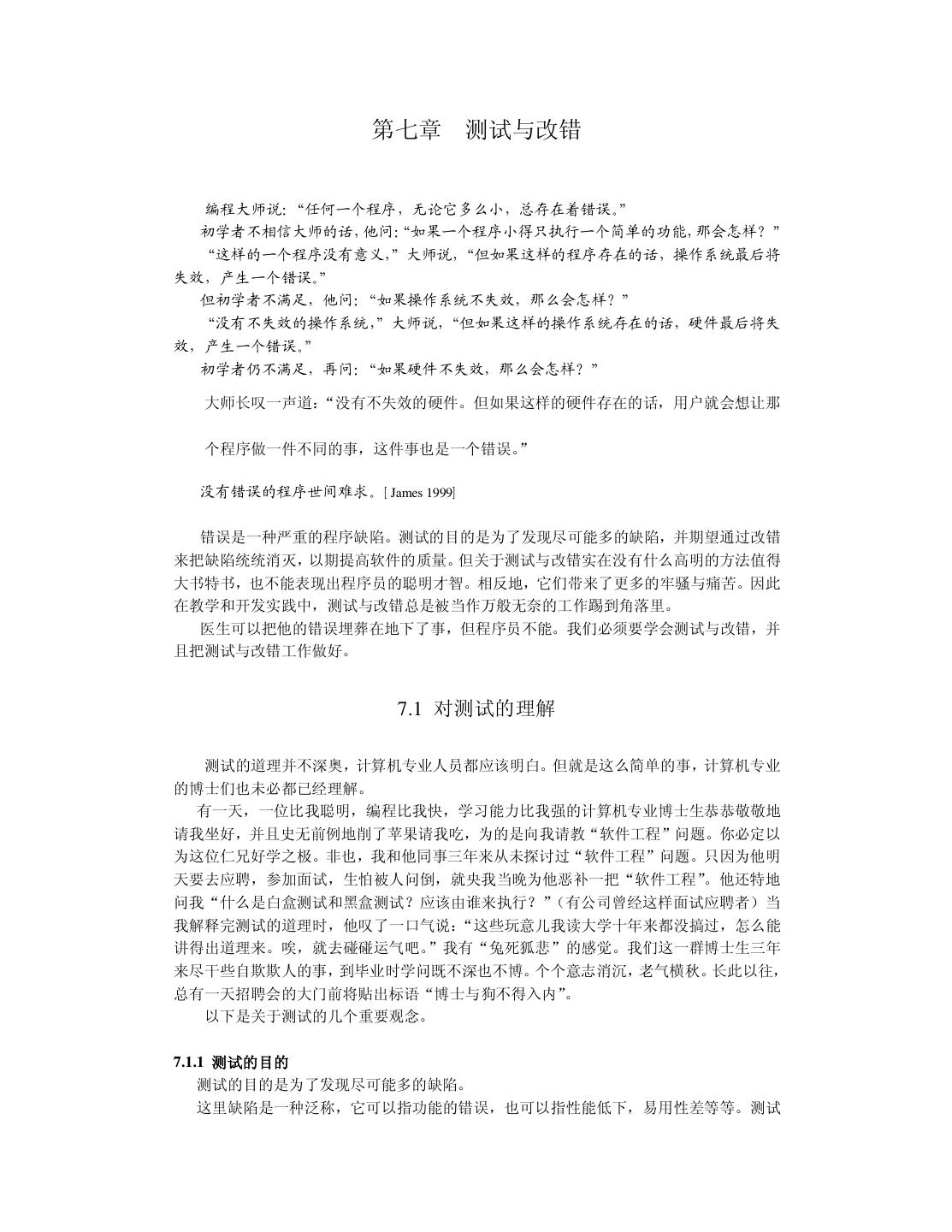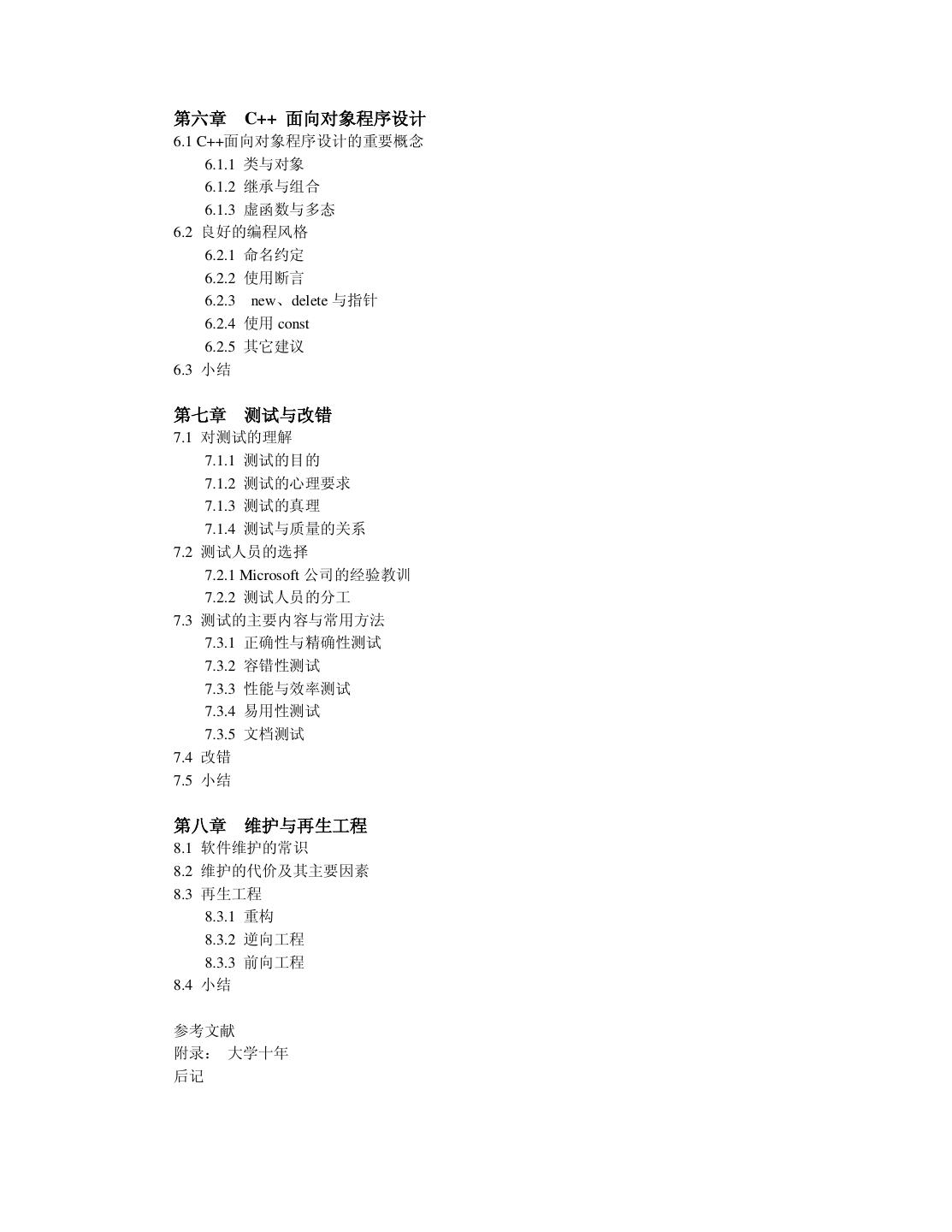7 .第六章 C++ 面向对象程序设计 6.1 C++面向对象程序设计的重要概念 6.1.1 类与对象 6.1.2 继承与组合 6.1.3 虚函数与多态 6.2 良好的编程风格 6.2.1 命名约定 6.2.2 使用断言 6.2.3 new、delete 与指针 6.2.4 使用 const 6.2.5 其它建议 6.3 小结 第七章 测试与改错 7.1 对测试的理解 7.1.1 测试的目的 7.1.2 测试的心理要求 7.1.3 测试的真理 7.1.4 测试与质量的关系 7.2 测试人员的选择 7.2.1 Microsoft 公司的经验教训 7.2.2 测试人员的分工 7.3 测试的主要内容与常用方法 7.3.1 正确性与精确性测试 7.3.2 容错性测试 7.3.3 性能与效率测试 7.3.4 易用性测试 7.3.5 文档测试 7.4 改错 7.5 小结 第八章 维护与再生工程 8.1 软件维护的常识 8.2 维护的代价及其主要因素 8.3 再生工程 8.3.1 重构 8.3.2 逆向工程 8.3.3 前向工程 8.4 小结 参考文献 附录: 大学十年 后记