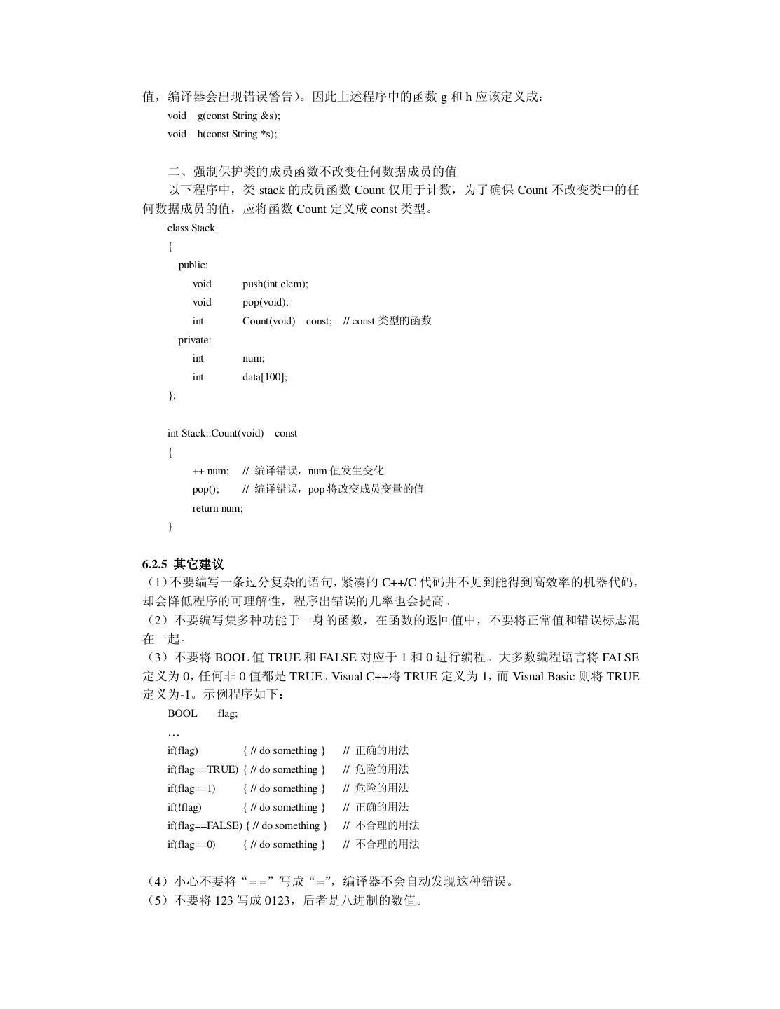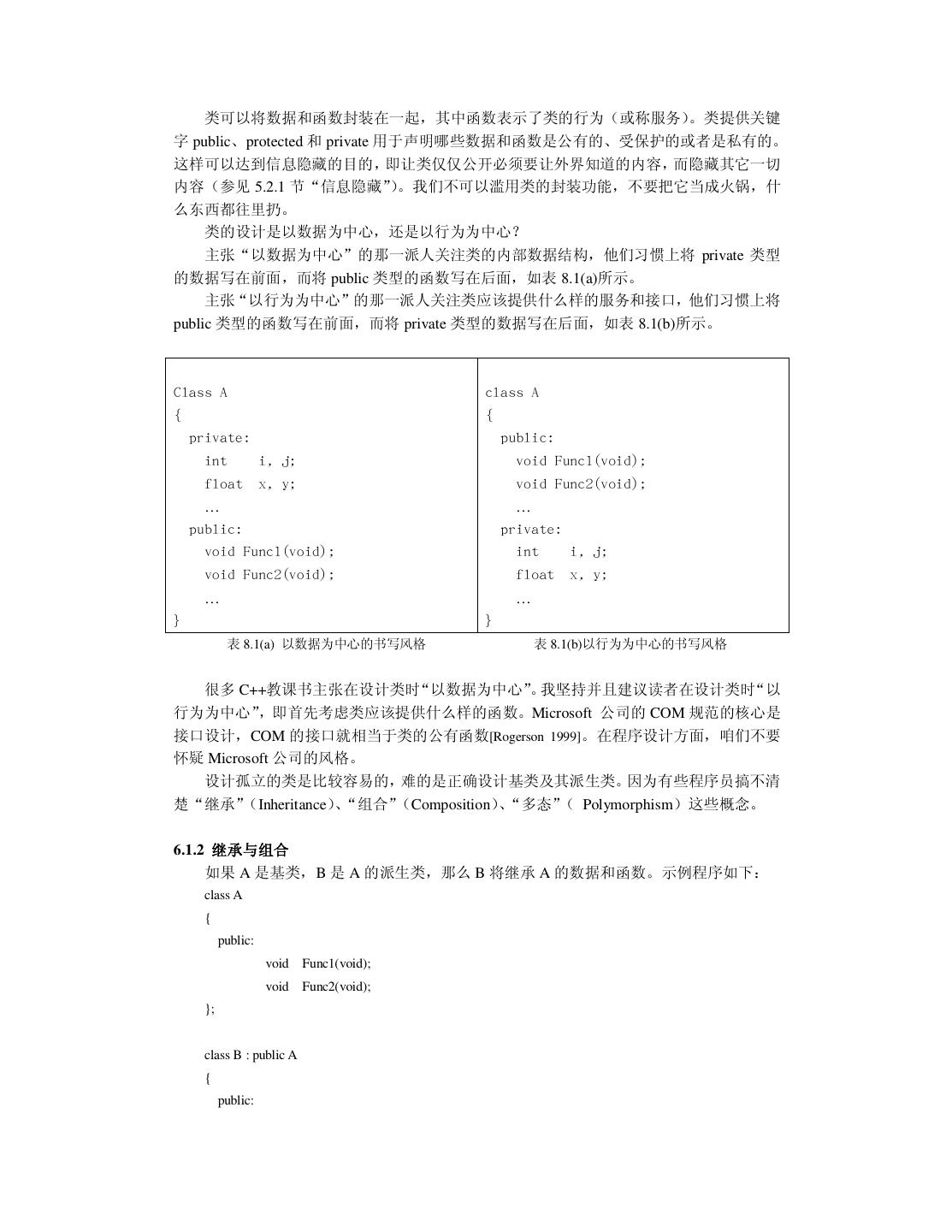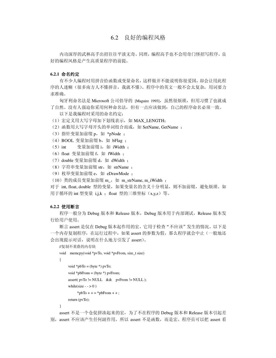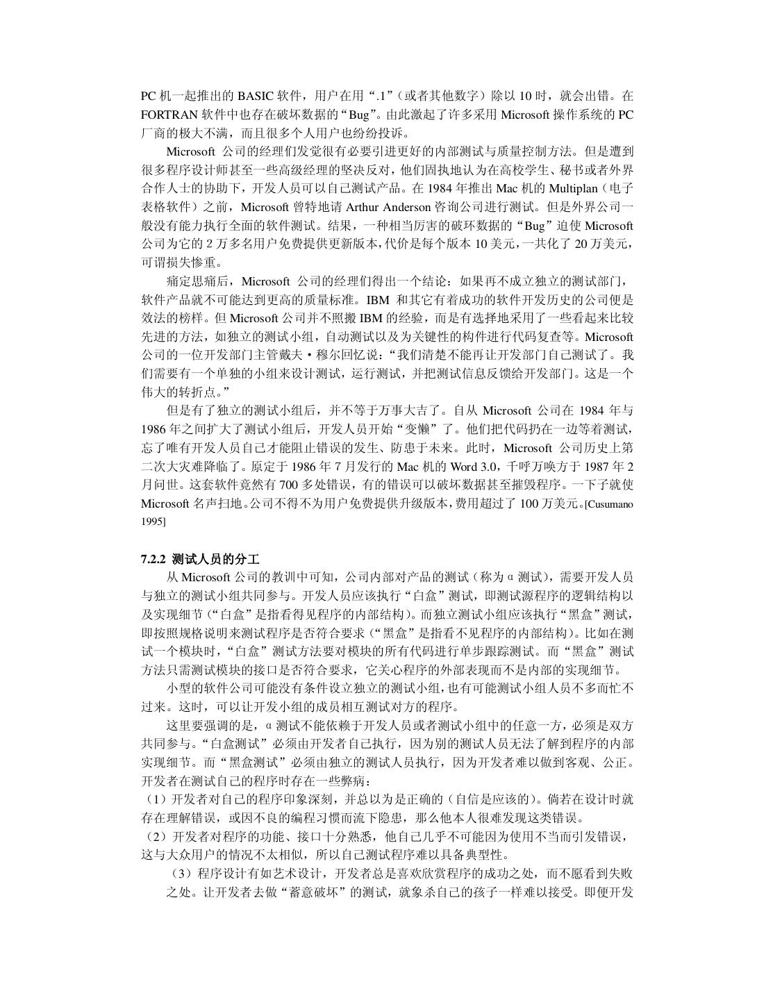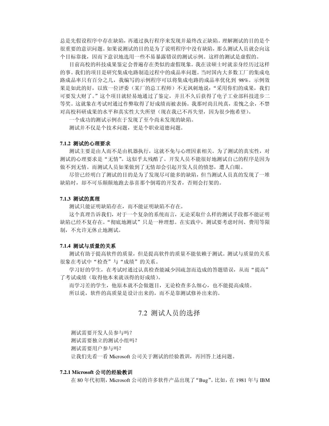 7 .第六章 C++ 面向对象程序设计 6.1 C++面向对象程序设计的重要概念 6.1.1 类与对象 6.1.2 继承与组合 6.1.3 虚函数与多态 6.2 良好的编程风格 6.2.1 命名约定 6.2.2 使用断言 6.2.3 new、delete 与指针 6.2.4 使用 const 6.2.5 其它建议 6.3 小结 第七章 测试与改错 7.1 对测试的理解 7.1.1 测试的目的 7.1.2 测试的心理要求 7.1.3 测试的真理 7.1.4 测试与质量的关系 7.2 测试人员的选择 7.2.1 Microsoft 公司的经验教训 7.2.2 测试人员的分工 7.3 测试的主要内容与常用方法 7.3.1 正确性与精确性测试 7.3.2 容错性测试 7.3.3 性能与效率测试 7.3.4 易用性测试 7.3.5 文档测试 7.4 改错 7.5 小结 第八章 维护与再生工程 8.1 软件维护的常识 8.2 维护的代价及其主要因素 8.3 再生工程 8.3.1 重构 8.3.2 逆向工程 8.3.3 前向工程 8.4 小结 参考文献 附录: 大学十年 后记
