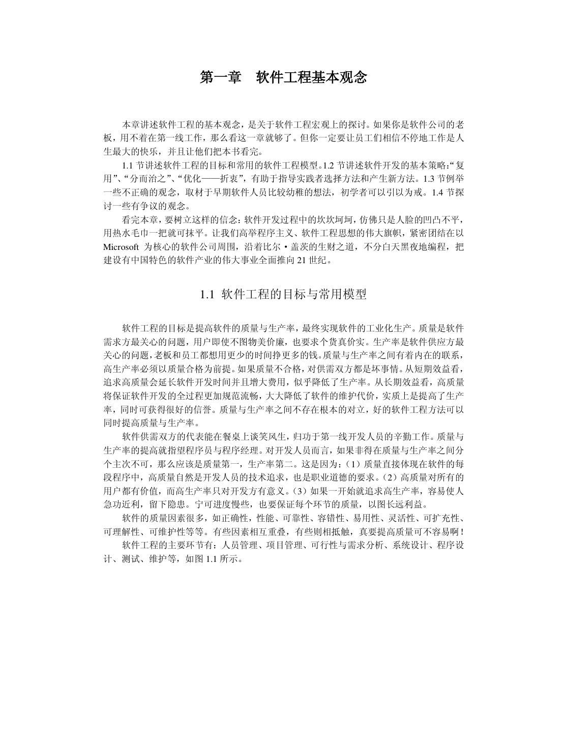 8 . 第一章 软件工程基本观念 本章讲述软件工程的基本观念,是关于软件工程宏观上的探讨。如果你是软件公司的老 板,用不着在第一线工作,那么看这一章就够了。但你一定要让员工们相信不停地工作是人 生最大的快乐,并且让他们把本书看完。 1.1 节讲述软件工程的目标和常用的软件工程模型。1.2 节讲述软件开发的基本策略: “复 用”、 “分而治之”、 “优化——折衷”,有助于指导实践者选择方法和产生新方法。1.3 节例举 一些不正确的观念,取材于早期软件人员比较幼稚的想法,初学者可以引以为戒。1.4 节探 讨一些有争议的观念。 看完本章,要树立这样的信念:软件开发过程中的坎坎坷坷,仿佛只是人脸的凹凸不平, 用热水毛巾一把就可抹平。让我们高举程序主义、软件工程思想的伟大旗帜,紧密团结在以 Microsoft 为核心的软件公司周围,沿着比尔·盖茨的生财之道,不分白天黑夜地编程,把 建设有中国特色的软件产业的伟大事业全面推向 21 世纪。 1.1 软件工程的目标与常用模型 软件工程的目标是提高软件的质量与生产率,最终实现软件的工业化生产。质量是软件 需求方最关心的问题,用户即使不图物美价廉,也要求个货真价实。生产率是软件供应方最 关心的问题,老板和员工都想用更少的时间挣更多的钱。质量与生产率之间有着内在的联系, 高生产率必须以质量合格为前提。如果质量不合格,对供需双方都是坏事情。从短期效益看, 追求高质量会延长软件开发时间并且增大费用,似乎降低了生产率。从长期效益看,高质量 将保证软件开发的全过程更加规范流畅,大大降低了软件的维护代价,实质上是提高了生产 率,同时可获得很好的信誉。质量与生产率之间不存在根本的对立,好的软件工程方法可以 同时提高质量与生产率。 软件供需双方的代表能在餐桌上谈笑风生,归功于第一线开发人员的辛勤工作。质量与 生产率的提高就指望程序员与程序经理。对开发人员而言,如果非得在质量与生产率之间分 个主次不可,那么应该是质量第一,生产率第二。这是因为:(1)质量直接体现在软件的每 段程序中,高质量自然是开发人员的技术追求,也是职业道德的要求。 (2)高质量对所有的 用户都有价值,而高生产率只对开发方有意义。(3)如果一开始就追求高生产率,容易使人 急功近利,留下隐患。宁可进度慢些,也要保证每个环节的质量,以图长远利益。 软件的质量因素很多,如正确性,性能、可靠性、容错性、易用性、灵活性、可扩充性、 可理解性、可维护性等等。有些因素相互重叠,有些则相抵触,真要提高质量可不容易啊! 软件工程的主要环节有:人员管理、项目管理、可行性与需求分析、系统设计、程序设 计、测试、维护等,如图 1.1 所示。