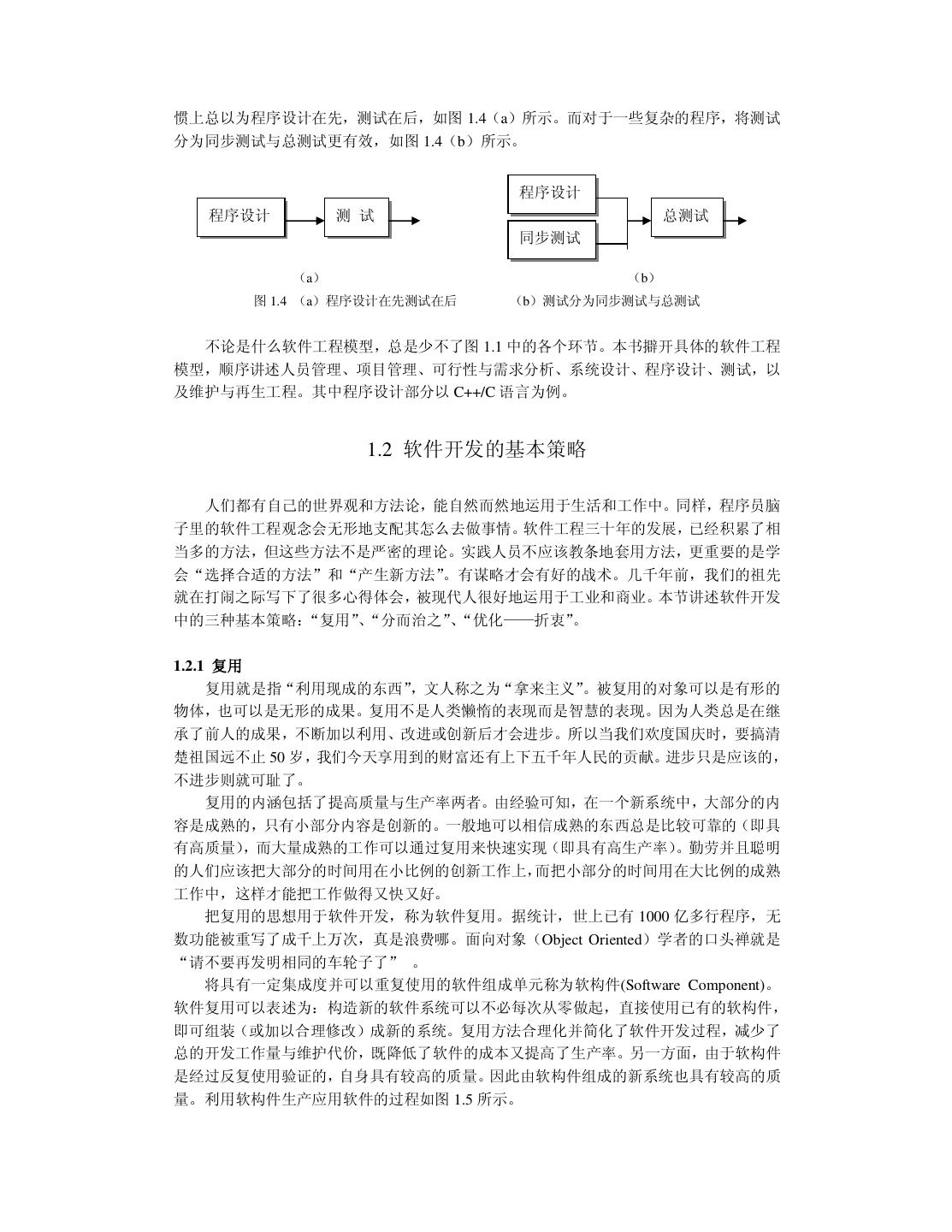 10 .惯上总以为程序设计在先,测试在后,如图 1.4(a)所示。而对于一些复杂的程序,将测试 分为同步测试与总测试更有效,如图 1.4(b)所示。 程序设计 程序设计 测 试 总测试 同步测试 (a) (b) 图 1.4 (a)程序设计在先测试在后 (b)测试分为同步测试与总测试 不论是什么软件工程模型,总是少不了图 1.1 中的各个环节。本书擗开具体的软件工程 模型,顺序讲述人员管理、项目管理、可行性与需求分析、系统设计、程序设计、测试,以 及维护与再生工程。其中程序设计部分以 C++/C 语言为例。 1.2 软件开发的基本策略 人们都有自己的世界观和方法论,能自然而然地运用于生活和工作中。同样,程序员脑 子里的软件工程观念会无形地支配其怎么去做事情。软件工程三十年的发展,已经积累了相 当多的方法,但这些方法不是严密的理论。实践人员不应该教条地套用方法,更重要的是学 会“选择合适的方法”和“产生新方法”。有谋略才会有好的战术。几千年前,我们的祖先 就在打闹之际写下了很多心得体会,被现代人很好地运用于工业和商业。本节讲述软件开发 中的三种基本策略:“复用”、 “分而治之”、 “优化——折衷”。 1.2.1 复用 复用就是指“利用现成的东西”,文人称之为“拿来主义”。被复用的对象可以是有形的 物体,也可以是无形的成果。复用不是人类懒惰的表现而是智慧的表现。因为人类总是在继 承了前人的成果,不断加以利用、改进或创新后才会进步。所以当我们欢度国庆时,要搞清 楚祖国远不止 50 岁,我们今天享用到的财富还有上下五千年人民的贡献。进步只是应该的, 不进步则就可耻了。 复用的内涵包括了提高质量与生产率两者。由经验可知,在一个新系统中,大部分的内 容是成熟的,只有小部分内容是创新的。一般地可以相信成熟的东西总是比较可靠的(即具 有高质量),而大量成熟的工作可以通过复用来快速实现(即具有高生产率)。勤劳并且聪明 的人们应该把大部分的时间用在小比例的创新工作上,而把小部分的时间用在大比例的成熟 工作中,这样才能把工作做得又快又好。 把复用的思想用于软件开发,称为软件复用。据统计,世上已有 1000 亿多行程序,无 数功能被重写了成千上万次,真是浪费哪。面向对象(Object Oriented)学者的口头禅就是 “请不要再发明相同的车轮子了” 。 将具有一定集成度并可以重复使用的软件组成单元称为软构件(Software Component)。 软件复用可以表述为:构造新的软件系统可以不必每次从零做起,直接使用已有的软构件, 即可组装(或加以合理修改)成新的系统。复用方法合理化并简化了软件开发过程,减少了 总的开发工作量与维护代价,既降低了软件的成本又提高了生产率。另一方面,由于软构件 是经过反复使用验证的,自身具有较高的质量。因此由软构件组成的新系统也具有较高的质 量。利用软构件生产应用软件的过程如图 1.5 所示。