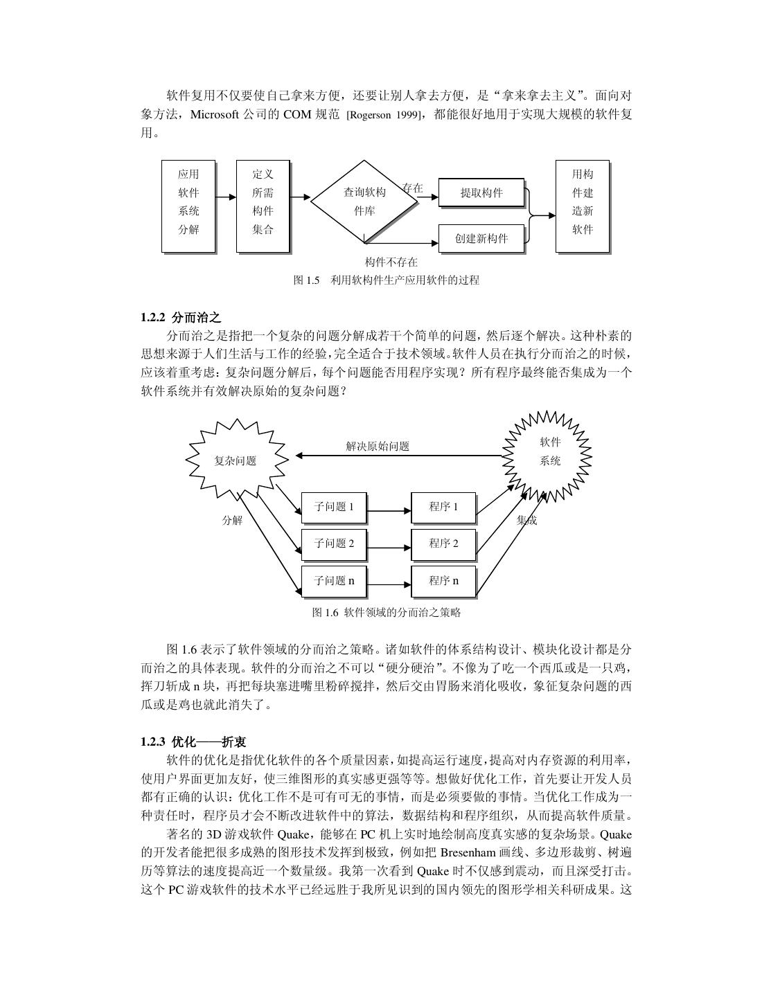 11 . 软件复用不仅要使自己拿来方便,还要让别人拿去方便,是“拿来拿去主义” 。面向对 象方法,Microsoft 公司的 COM 规范 [Rogerson 1999],都能很好地用于实现大规模的软件复 用。 应用 定义 用构 软件 所需 查询软构 存在 提取构件 件建 系统 构件 件库 造新 分解 集合 软件 创建新构件 构件不存在 图 1.5 利用软构件生产应用软件的过程 1.2.2 分而治之 分而治之是指把一个复杂的问题分解成若干个简单的问题,然后逐个解决。这种朴素的 思想来源于人们生活与工作的经验,完全适合于技术领域。软件人员在执行分而治之的时候, 应该着重考虑:复杂问题分解后,每个问题能否用程序实现?所有程序最终能否集成为一个 软件系统并有效解决原始的复杂问题? 解决原始问题 软件 复杂问题 系统 子问题 1 程序 1 分解 集成 子问题 2 程序 2 子问题 n 程序 n 图 1.6 软件领域的分而治之策略 图 1.6 表示了软件领域的分而治之策略。诸如软件的体系结构设计、模块化设计都是分 而治之的具体表现。软件的分而治之不可以“硬分硬治” 。不像为了吃一个西瓜或是一只鸡, 挥刀斩成 n 块,再把每块塞进嘴里粉碎搅拌,然后交由胃肠来消化吸收,象征复杂问题的西 瓜或是鸡也就此消失了。 1.2.3 优化——折衷 软件的优化是指优化软件的各个质量因素,如提高运行速度, 提高对内存资源的利用率, 使用户界面更加友好,使三维图形的真实感更强等等。想做好优化工作,首先要让开发人员 都有正确的认识:优化工作不是可有可无的事情,而是必须要做的事情。当优化工作成为一 种责任时,程序员才会不断改进软件中的算法,数据结构和程序组织,从而提高软件质量。 著名的 3D 游戏软件 Quake,能够在 PC 机上实时地绘制高度真实感的复杂场景。Quake 的开发者能把很多成熟的图形技术发挥到极致,例如把 Bresenham 画线、多边形裁剪、树遍 历等算法的速度提高近一个数量级。我第一次看到 Quake 时不仅感到震动,而且深受打击。 这个 PC 游戏软件的技术水平已经远胜于我所见识到的国内领先的图形学相关科研成果。这