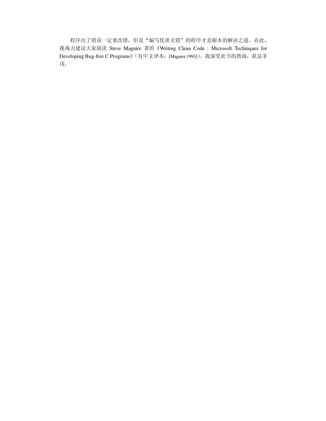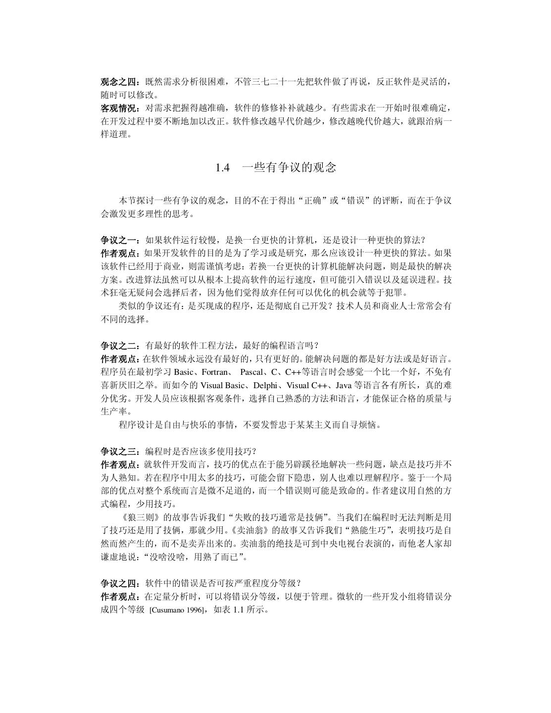 13 .观念之四:既然需求分析很困难,不管三七二十一先把软件做了再说,反正软件是灵活的, 随时可以修改。 客观情况:对需求把握得越准确,软件的修修补补就越少。有些需求在一开始时很难确定, 在开发过程中要不断地加以改正。软件修改越早代价越少,修改越晚代价越大,就跟治病一 样道理。 1.4 一些有争议的观念 本节探讨一些有争议的观念,目的不在于得出“正确”或“错误”的评断,而在于争议 会激发更多理性的思考。 争议之一:如果软件运行较慢,是换一台更快的计算机,还是设计一种更快的算法? 作者观点:如果开发软件的目的是为了学习或是研究,那么应该设计一种更快的算法。如果 该软件已经用于商业,则需谨慎考虑:若换一台更快的计算机能解决问题,则是最快的解决 方案。改进算法虽然可以从根本上提高软件的运行速度,但可能引入错误以及延误进程。技 术狂毫无疑问会选择后者,因为他们觉得放弃任何可以优化的机会就等于犯罪。 类似的争议还有:是买现成的程序,还是彻底自己开发?技术人员和商业人士常常会有 不同的选择。 争议之二:有最好的软件工程方法,最好的编程语言吗? 作者观点:在软件领域永远没有最好的,只有更好的。能解决问题的都是好方法或是好语言。 程序员在最初学习 Basic、Fortran、 Pascal、C、C++等语言时会感觉一个比一个好,不免有 喜新厌旧之举。而如今的 Visual Basic、Delphi、Visual C++、Java 等语言各有所长,真的难 分优劣。开发人员应该根据客观条件,选择自己熟悉的方法和语言,才能保证合格的质量与 生产率。 程序设计是自由与快乐的事情,不要发誓忠于某某主义而自寻烦恼。 争议之三:编程时是否应该多使用技巧? 作者观点:就软件开发而言,技巧的优点在于能另辟蹊径地解决一些问题,缺点是技巧并不 为人熟知。若在程序中用太多的技巧,可能会留下隐患,别人也难以理解程序。鉴于一个局 部的优点对整个系统而言是微不足道的,而一个错误则可能是致命的。作者建议用自然的方 式编程,少用技巧。 《狼三则》的故事告诉我们“失败的技巧通常是技俩”。当我们在编程时无法判断是用 了技巧还是用了技俩,那就少用。《卖油翁》的故事又告诉我们“熟能生巧” ,表明技巧是自 然而然产生的,而不是卖弄出来的。卖油翁的绝技是可到中央电视台表演的,而他老人家却 谦虚地说:“没啥没啥,用熟了而已”。 争议之四:软件中的错误是否可按严重程度分等级? 作者观点:在定量分析时,可以将错误分等级,以便于管理。微软的一些开发小组将错误分 成四个等级 [Cusumano 1996],如表 1.1 所示。
