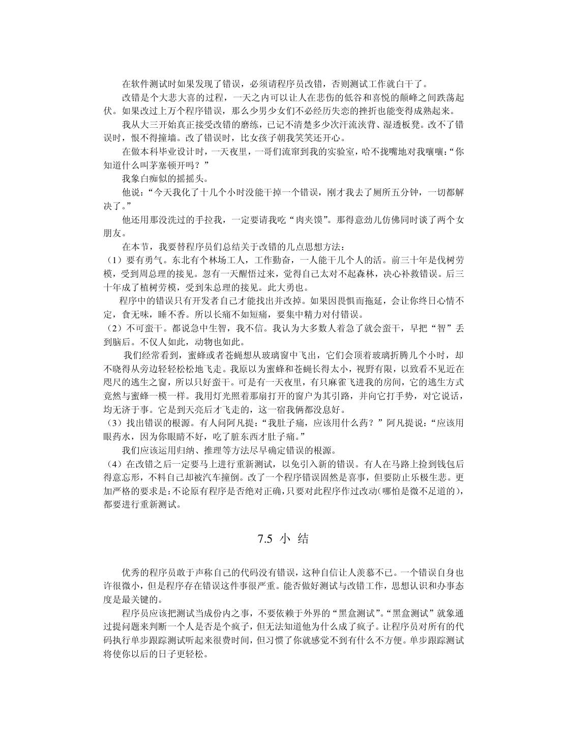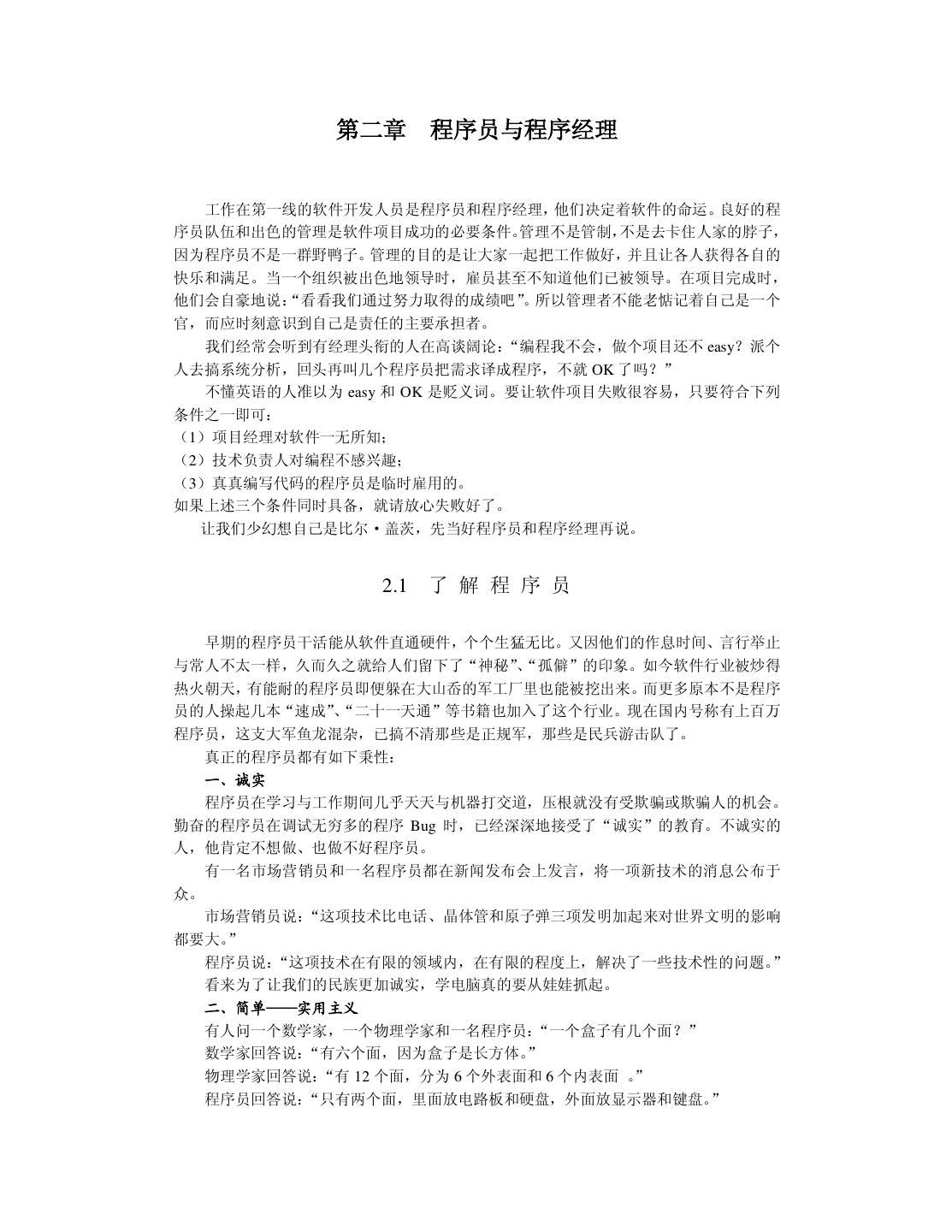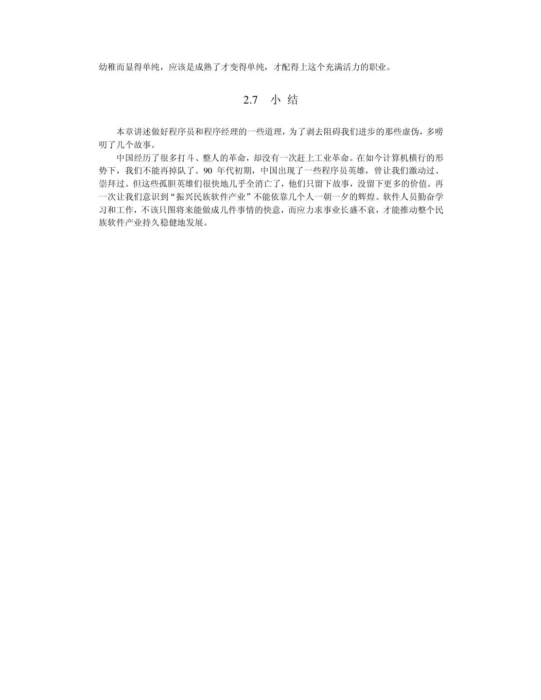 21 .幼稚而显得单纯,应该是成熟了才变得单纯,才配得上这个充满活力的职业。 2.7 小 结 本章讲述做好程序员和程序经理的一些道理,为了剥去阻碍我们进步的那些虚伪,多唠 叨了几个故事。 中国经历了很多打斗、整人的革命,却没有一次赶上工业革命。在如今计算机横行的形 势下,我们不能再掉队了。90 年代初期,中国出现了一些程序员英雄,曾让我们激动过、 崇拜过。但这些孤胆英雄们很快地几乎全消亡了,他们只留下故事,没留下更多的价值。再 一次让我们意识到“振兴民族软件产业”不能依靠几个人一朝一夕的辉煌。软件人员勤奋学 习和工作,不该只图将来能做成几件事情的快意,而应力求事业长盛不衰,才能推动整个民 族软件产业持久稳健地发展。