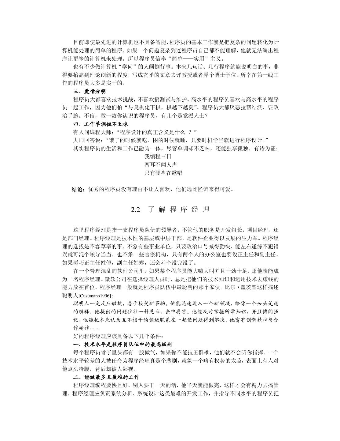 16 . 目前即使最先进的计算机也不具备智能,程序员的基本工作就是把复杂的问题转化为计 算机能处理的简单的程序。如果一个问题复杂到连程序员自己都不能理解,他就无法编出程 序让更笨的计算机来处理。所以程序员信奉“简单——实用”主义。 也有不少做计算机“学问”的人颠倒行事。本来几句话、几行程序就能说明白的事,非 得要抬高到理论创新的程度,写成玄乎的文章去评教授或者弄个博士学位。所幸在第一线工 作的程序员大多是实干的。 三、爱憎分明 程序员大都喜欢技术挑战,不喜欢搞测试与维护。高水平的程序员喜欢与高水平的程序 员一起工作,因为他们怕“与臭棋佬下棋,棋越下越臭”。程序员大都厌恶拉帮结派、耍政 治手腕。不信,数一数你认识的程序员,有几个是党派人士? 四、工作单调但不乏味 有人问编程大师:“程序设计的真正含义是什么 ?” 大师回答说: “饿了的时候就吃,困的时候就睡,只要时机恰当就进行程序设计。” 其实程序员的生活和工作已融为一体,尽管单调却不乏味,还能独享孤独。有诗为证: 我编程三日 两耳不闻人声 只有硬盘在歌唱 结论:优秀的程序员没有理由不让人喜欢,他们远比怪僻来得可爱。 2.2 了 解 程 序 经 理 这里程序经理是指一支程序员队伍的领导者,不管他的职务是开发组长,项目经理,还 是部门经理。程序经理是技术性的基层或中层干部,是软件企业得以发展的生力军。程序经 理的选拔是不容草率的事。不象有些事业单位,只要政治口号喊得勤快、能左右逢缘不犯错 误就可混个领导当当。也不象一些官僚机构,只有两个人的办公室也要设正主任和副主任。 如果碰巧正主任姓傅,副主任姓郑,还会斗个没完没了。 在一个管理混乱的软件公司里,如果某个程序员能大喊大叫并且干劲十足,那他就能成 为一名程序经理。微软公司在选择经理人员时,总是把他们的技术知识和运用技术去赚钱的 能力放在首位。程序经理一般就是程序员队伍中最聪明的那个家伙。比尔·盖茨曾这样描述 聪明人[Cusumano1996]: 聪明人一定反应敏捷,善于接受新事物。他能迅速进入一个新领域,给你一个头头是道 的解释。他提出的问题往往一针见血、击中要害。他能及时掌握所学知识,并且博闻强 记,他能把本来认为互不相干的领域联系在一起使问题得到解决。他富有创新精神与合 作精神…… 好的程序经理应该具备以下几个条件: 一、技术水平是程序员队伍中的最高级别 每个程序员骨子里头都有一股傲气,如果你不能技压群雄,他们就不会听你指挥。一个 技术水平较差的人被任命为程序经理真是个悲剧,就象一个略有权势的太监,表面上有人对 他点头哈腰,背后却被人鄙视。 二、能做最多且最难的工作 程序经理编程要快且好。别人要干一天的活,他半天就能做完,这样才会有精力去搞管 理。程序经理应负责系统分析、系统设计这类最难的开发工作,并指导不同水平的程序员把
