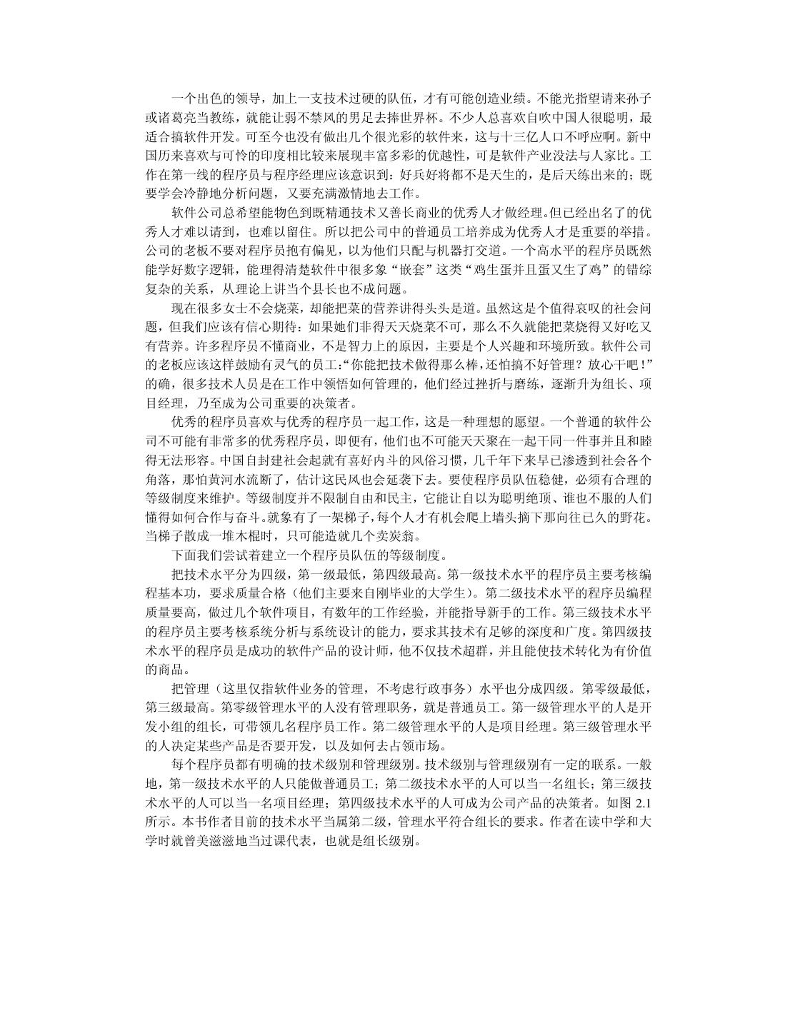 18 . 一个出色的领导,加上一支技术过硬的队伍,才有可能创造业绩。不能光指望请来孙子 或诸葛亮当教练,就能让弱不禁风的男足去捧世界杯。不少人总喜欢自吹中国人很聪明,最 适合搞软件开发。可至今也没有做出几个很光彩的软件来,这与十三亿人口不呼应啊。新中 国历来喜欢与可怜的印度相比较来展现丰富多彩的优越性,可是软件产业没法与人家比。工 作在第一线的程序员与程序经理应该意识到:好兵好将都不是天生的,是后天练出来的;既 要学会冷静地分析问题,又要充满激情地去工作。 软件公司总希望能物色到既精通技术又善长商业的优秀人才做经理。但已经出名了的优 秀人才难以请到,也难以留住。所以把公司中的普通员工培养成为优秀人才是重要的举措。 公司的老板不要对程序员抱有偏见,以为他们只配与机器打交道。一个高水平的程序员既然 能学好数字逻辑,能理得清楚软件中很多象“嵌套”这类“鸡生蛋并且蛋又生了鸡”的错综 复杂的关系,从理论上讲当个县长也不成问题。 现在很多女士不会烧菜,却能把菜的营养讲得头头是道。虽然这是个值得哀叹的社会问 题,但我们应该有信心期待:如果她们非得天天烧菜不可,那么不久就能把菜烧得又好吃又 有营养。许多程序员不懂商业,不是智力上的原因,主要是个人兴趣和环境所致。软件公司 的老板应该这样鼓励有灵气的员工: “你能把技术做得那么棒,还怕搞不好管理?放心干吧!” 的确,很多技术人员是在工作中领悟如何管理的,他们经过挫折与磨练,逐渐升为组长、项 目经理,乃至成为公司重要的决策者。 优秀的程序员喜欢与优秀的程序员一起工作,这是一种理想的愿望。一个普通的软件公 司不可能有非常多的优秀程序员,即便有,他们也不可能天天聚在一起干同一件事并且和睦 得无法形容。中国自封建社会起就有喜好内斗的风俗习惯,几千年下来早已渗透到社会各个 角落,那怕黄河水流断了,估计这民风也会延袭下去。要使程序员队伍稳健,必须有合理的 等级制度来维护。等级制度并不限制自由和民主,它能让自以为聪明绝顶、谁也不服的人们 懂得如何合作与奋斗。就象有了一架梯子,每个人才有机会爬上墙头摘下那向往已久的野花。 当梯子散成一堆木棍时,只可能造就几个卖炭翁。 下面我们尝试着建立一个程序员队伍的等级制度。 把技术水平分为四级,第一级最低,第四级最高。第一级技术水平的程序员主要考核编 程基本功,要求质量合格(他们主要来自刚毕业的大学生)。第二级技术水平的程序员编程 质量要高,做过几个软件项目,有数年的工作经验,并能指导新手的工作。第三级技术水平 的程序员主要考核系统分析与系统设计的能力,要求其技术有足够的深度和广度。第四级技 术水平的程序员是成功的软件产品的设计师,他不仅技术超群,并且能使技术转化为有价值 的商品。 把管理(这里仅指软件业务的管理,不考虑行政事务)水平也分成四级。第零级最低, 第三级最高。第零级管理水平的人没有管理职务,就是普通员工。第一级管理水平的人是开 发小组的组长,可带领几名程序员工作。第二级管理水平的人是项目经理。第三级管理水平 的人决定某些产品是否要开发,以及如何去占领市场。 每个程序员都有明确的技术级别和管理级别。技术级别与管理级别有一定的联系。一般 地,第一级技术水平的人只能做普通员工;第二级技术水平的人可以当一名组长;第三级技 术水平的人可以当一名项目经理;第四级技术水平的人可成为公司产品的决策者。如图 2.1 所示。本书作者目前的技术水平当属第二级,管理水平符合组长的要求。作者在读中学和大 学时就曾美滋滋地当过课代表,也就是组长级别。