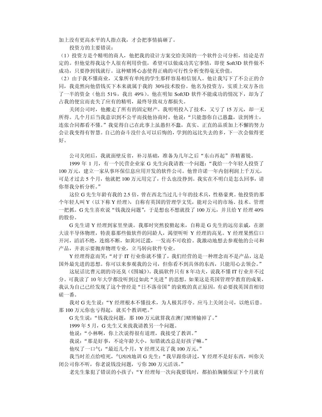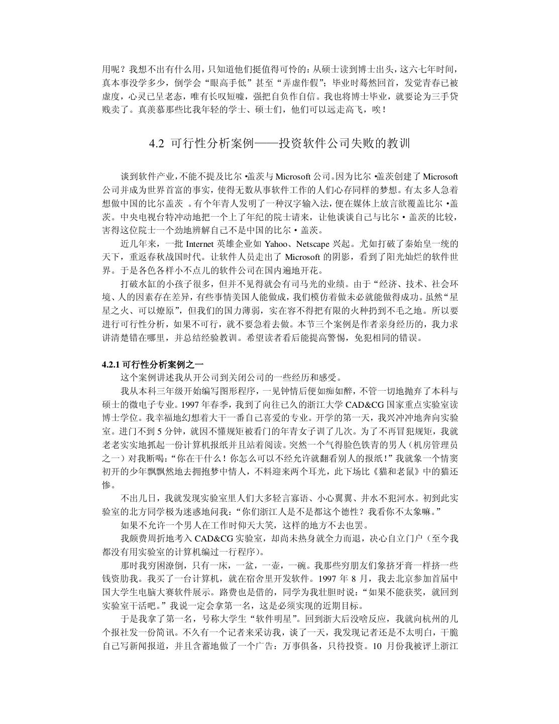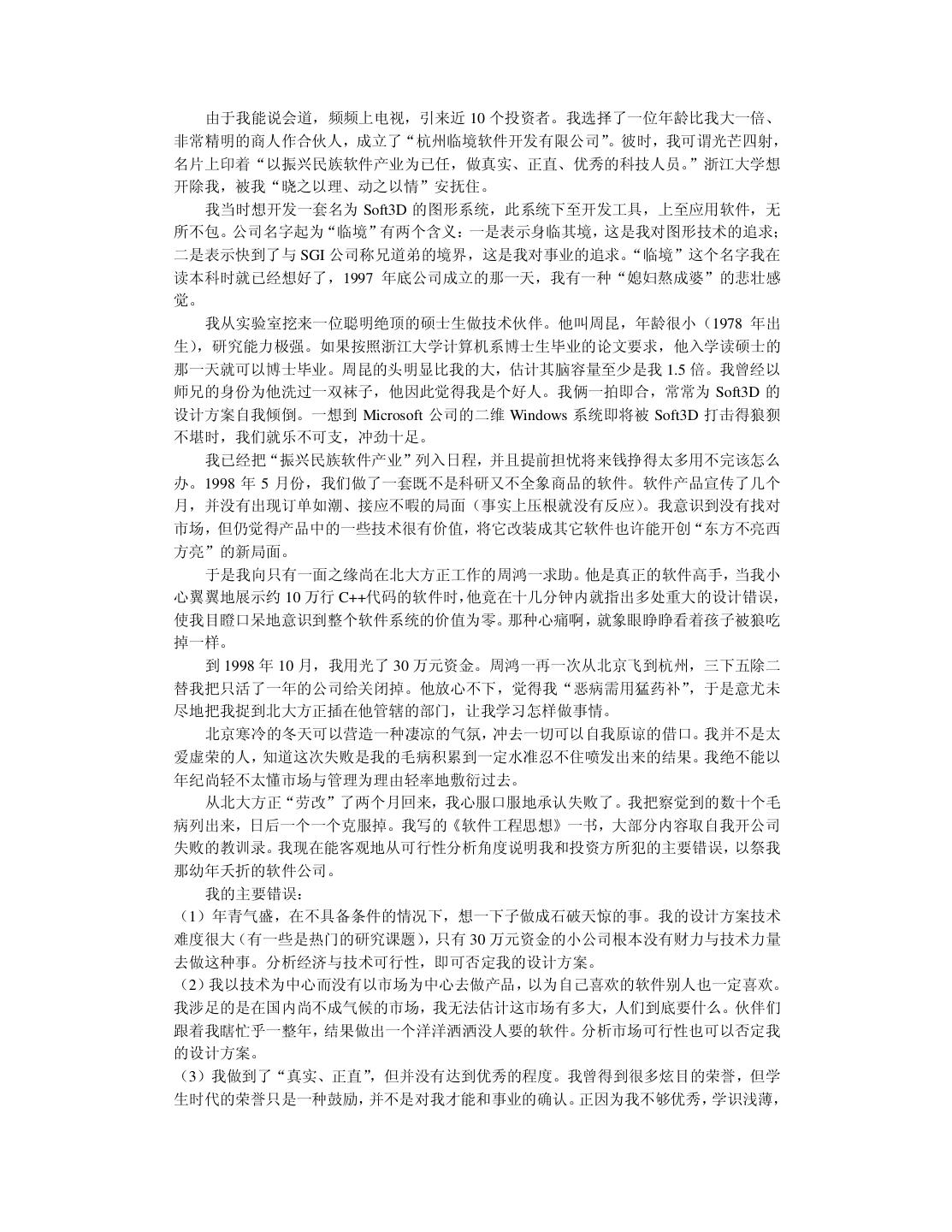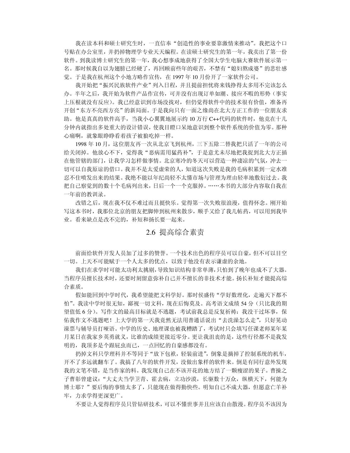 20 . 我在读本科和硕士研究生时,一直信奉“创造性的事业要靠激情来推动”。我把这个口 号贴在办公室里,并扔掉物理学专业天天编程。在读硕士研究生的第一年,我卖出了第一份 软件。到我读博士研究生的第一年,我心想事成地获得了全国大学生电脑大赛软件展示第一 名。那时候我自以为翅膀已经硬了,再回顾前些年的艰苦,不禁有“媳妇熬成婆”的悲壮感 觉。于是我在杭州这个小地方略作宣传,在 1997 年 10 月份开了一家软件公司。 我开始把“振兴民族软件产业”列入日程,并且提前担忧将来钱挣得太多用不完该怎么 办。半年之后,我开始为软件产品作宣传,可并没有出现订单如潮、接应不暇的形势(事实 上压根就没有反应)。我已经意识到市场没找对,但仍觉得软件中的技术很有价值,准备再 开创“东方不亮西方亮”的新局面。于是我向只有一面之缘尚在北大方正工作的一位朋友求 助。他是真真的软件高手,当我小心翼翼地展示约 10 万行 C++代码的软件时,他竞在十几 分钟内就指出多处重大的设计错误,使我目瞪口呆地意识到整个软件系统的价值为零。那种 心痛啊,就象眼睁睁看着孩子被狼吃掉一样。 1998 年 10 月,这位朋友再一次从北京飞到杭州,三下五除二替我把只活了一年的公司 给关闭掉。他放心不下,觉得我“恶病需用猛药补” ,于是意尤未尽地把我捉到北大方正插 在他管辖的部门,让我学习怎样做事情。北京寒冷的冬天可以营造一种凄凉的气氛,冲去一 切可以自我原谅的借口。我并不是太爱虚荣的人,知道这次失败是我的毛病积累到一定水准 忍不住喷发出来的结果。我绝不能以年纪尚轻不太懂市场与管理为理由轻率地敷衍过去。我 把自己察觉到的数十个毛病列出来,日后一个一个克服掉。……本书的大部分内容取自我在 一年前的教训录。 改错之后,现在我不仅不难过而且挺快乐。觉得第一次失败很浪漫,值得怀念。刚开始 写这本书时,我那位北京的朋友把脚伸到杭州来散步,顺手又给了我几帖药,可以用到我毕 业。看来缺点是改不完的,补短和扬长要一起来。 2.6 提高综合素责 前面给软件开发人员加了过多的赞誉。一个技术出色的程序员可以自豪,但不可以目空 一切。上天不可能赋于一个人太多的优点,以致于他没有表示谦虚的余地。 我们在求学时可能太功利太挑剔,导致知识结构非常单薄,只怕到了晚年也成不了大器。 当程序员擅长技术时,还要时刻留意弥补自己并不擅长的非技术才能。扬长补短才能提高综 合素质。 假如能回到中学时代,我希望能把文科学好。那时侯盛传“学好数理化,走遍天下都不 怕”。我读中学时很无知,鄙视一切文科,现在后悔莫及。高考语文成绩 54 分(只比我的期 望值低 6 分) 。写作文的最高目标就是不逃题,考试前我总是反复祈祷:我没干过坏事,保 佑我作文不逃题吧!上大学的第一天我竟然无法用普通话说出“去洗澡怎么走” ,只好晃动 澡票与辅导员打哑语。中学的历史、地理课也被我糟踏了,考试时只会填写任课老师某年某 月某日在我家乡英勇就义,比谁的成绩更接近零分。更让我沮丧的是,这些行径都不是我发 明的,我顶多是个跟屁虫而已,一点回忆的自豪感都没有。 扔掉文科只学理科并不等同于“放下包袱,轻装前进”,倒象是摘掉了控制系统的机车, 开不了多远就翻车了。我搞了八年的软件开发,没做出象样的软件来。倒是有同行意外发现 我的文笔不错,是当作家的料。我发现自己在不该开花的地方结了一颗瘦涩的果子。曹操之 子曹彰曾建议:“大丈夫当学卫青、霍去病,立功沙漠,长驱数十万众,纵横天下,何能为 博士耶?”要后悔的事情太多了,只能现在做得勤快些。明知自己不成大器,但愿意亡羊补 牢,力求学得更深更广。 不要让人觉得程序员只管钻研技术,可以不懂世事并且应该自由散漫。程序员不该因为