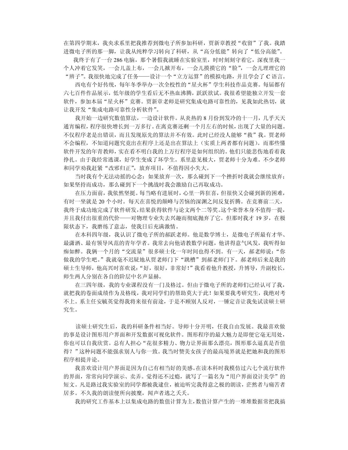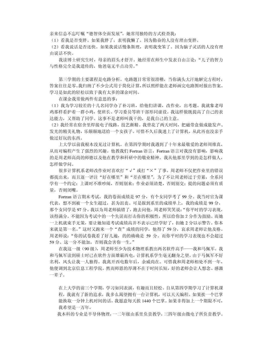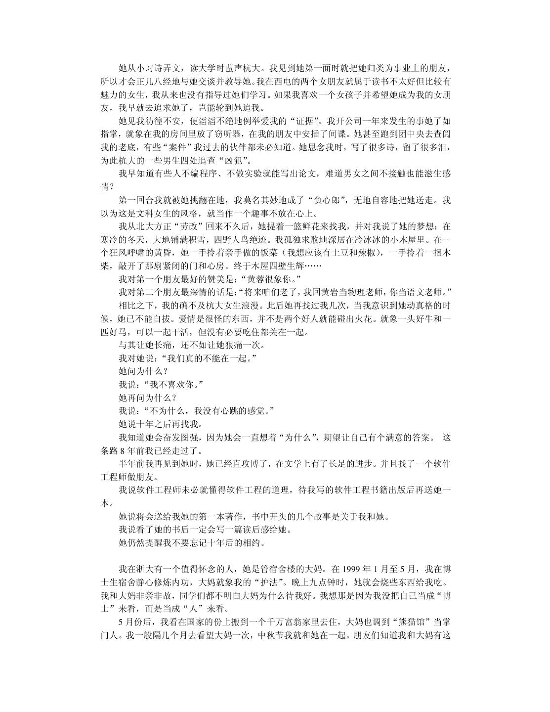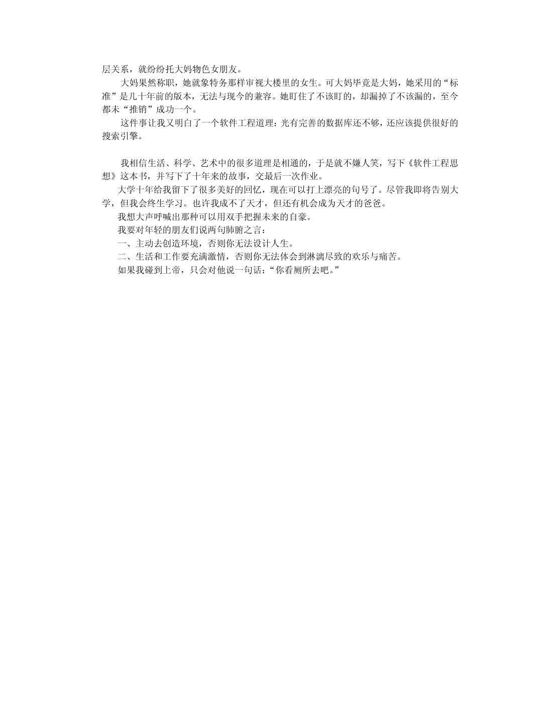 20 . 我在读本科和硕士研究生时,一直信奉“创造性的事业要靠激情来推动”。我把这个口 号贴在办公室里,并扔掉物理学专业天天编程。在读硕士研究生的第一年,我卖出了第一份 软件。到我读博士研究生的第一年,我心想事成地获得了全国大学生电脑大赛软件展示第一 名。那时候我自以为翅膀已经硬了,再回顾前些年的艰苦,不禁有“媳妇熬成婆”的悲壮感 觉。于是我在杭州这个小地方略作宣传,在 1997 年 10 月份开了一家软件公司。 我开始把“振兴民族软件产业”列入日程,并且提前担忧将来钱挣得太多用不完该怎么 办。半年之后,我开始为软件产品作宣传,可并没有出现订单如潮、接应不暇的形势(事实 上压根就没有反应)。我已经意识到市场没找对,但仍觉得软件中的技术很有价值,准备再 开创“东方不亮西方亮”的新局面。于是我向只有一面之缘尚在北大方正工作的一位朋友求 助。他是真真的软件高手,当我小心翼翼地展示约 10 万行 C++代码的软件时,他竞在十几 分钟内就指出多处重大的设计错误,使我目瞪口呆地意识到整个软件系统的价值为零。那种 心痛啊,就象眼睁睁看着孩子被狼吃掉一样。 1998 年 10 月,这位朋友再一次从北京飞到杭州,三下五除二替我把只活了一年的公司 给关闭掉。他放心不下,觉得我“恶病需用猛药补” ,于是意尤未尽地把我捉到北大方正插 在他管辖的部门,让我学习怎样做事情。北京寒冷的冬天可以营造一种凄凉的气氛,冲去一 切可以自我原谅的借口。我并不是太爱虚荣的人,知道这次失败是我的毛病积累到一定水准 忍不住喷发出来的结果。我绝不能以年纪尚轻不太懂市场与管理为理由轻率地敷衍过去。我 把自己察觉到的数十个毛病列出来,日后一个一个克服掉。……本书的大部分内容取自我在 一年前的教训录。 改错之后,现在我不仅不难过而且挺快乐。觉得第一次失败很浪漫,值得怀念。刚开始 写这本书时,我那位北京的朋友把脚伸到杭州来散步,顺手又给了我几帖药,可以用到我毕 业。看来缺点是改不完的,补短和扬长要一起来。 2.6 提高综合素责 前面给软件开发人员加了过多的赞誉。一个技术出色的程序员可以自豪,但不可以目空 一切。上天不可能赋于一个人太多的优点,以致于他没有表示谦虚的余地。 我们在求学时可能太功利太挑剔,导致知识结构非常单薄,只怕到了晚年也成不了大器。 当程序员擅长技术时,还要时刻留意弥补自己并不擅长的非技术才能。扬长补短才能提高综 合素质。 假如能回到中学时代,我希望能把文科学好。那时侯盛传“学好数理化,走遍天下都不 怕”。我读中学时很无知,鄙视一切文科,现在后悔莫及。高考语文成绩 54 分(只比我的期 望值低 6 分) 。写作文的最高目标就是不逃题,考试前我总是反复祈祷:我没干过坏事,保 佑我作文不逃题吧!上大学的第一天我竟然无法用普通话说出“去洗澡怎么走” ,只好晃动 澡票与辅导员打哑语。中学的历史、地理课也被我糟踏了,考试时只会填写任课老师某年某 月某日在我家乡英勇就义,比谁的成绩更接近零分。更让我沮丧的是,这些行径都不是我发 明的,我顶多是个跟屁虫而已,一点回忆的自豪感都没有。 扔掉文科只学理科并不等同于“放下包袱,轻装前进”,倒象是摘掉了控制系统的机车, 开不了多远就翻车了。我搞了八年的软件开发,没做出象样的软件来。倒是有同行意外发现 我的文笔不错,是当作家的料。我发现自己在不该开花的地方结了一颗瘦涩的果子。曹操之 子曹彰曾建议:“大丈夫当学卫青、霍去病,立功沙漠,长驱数十万众,纵横天下,何能为 博士耶?”要后悔的事情太多了,只能现在做得勤快些。明知自己不成大器,但愿意亡羊补 牢,力求学得更深更广。 不要让人觉得程序员只管钻研技术,可以不懂世事并且应该自由散漫。程序员不该因为