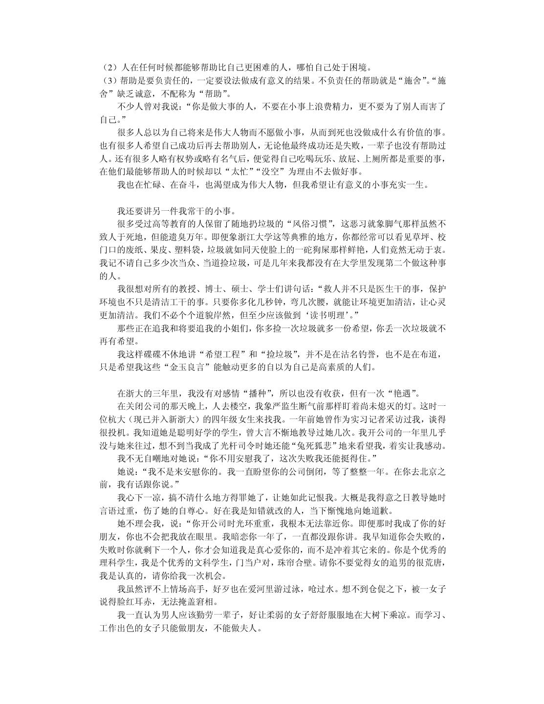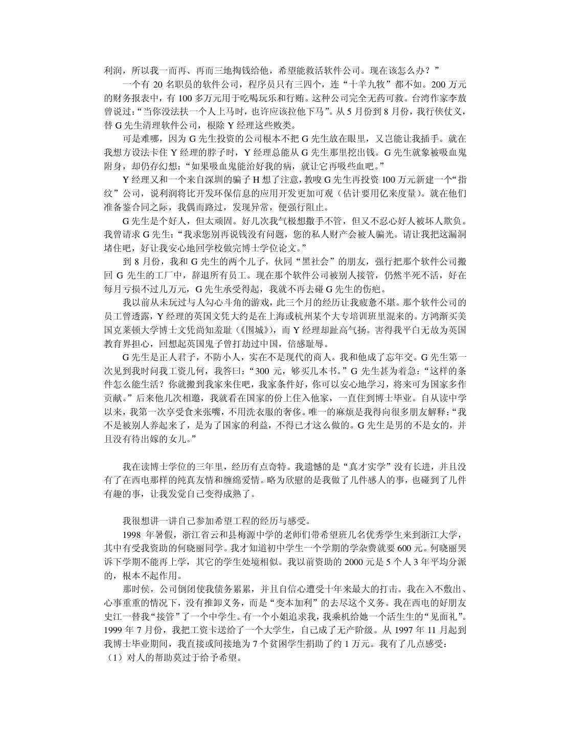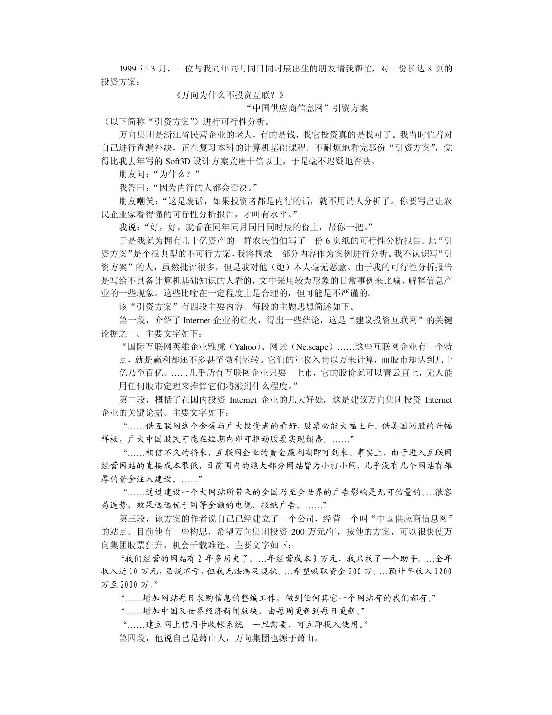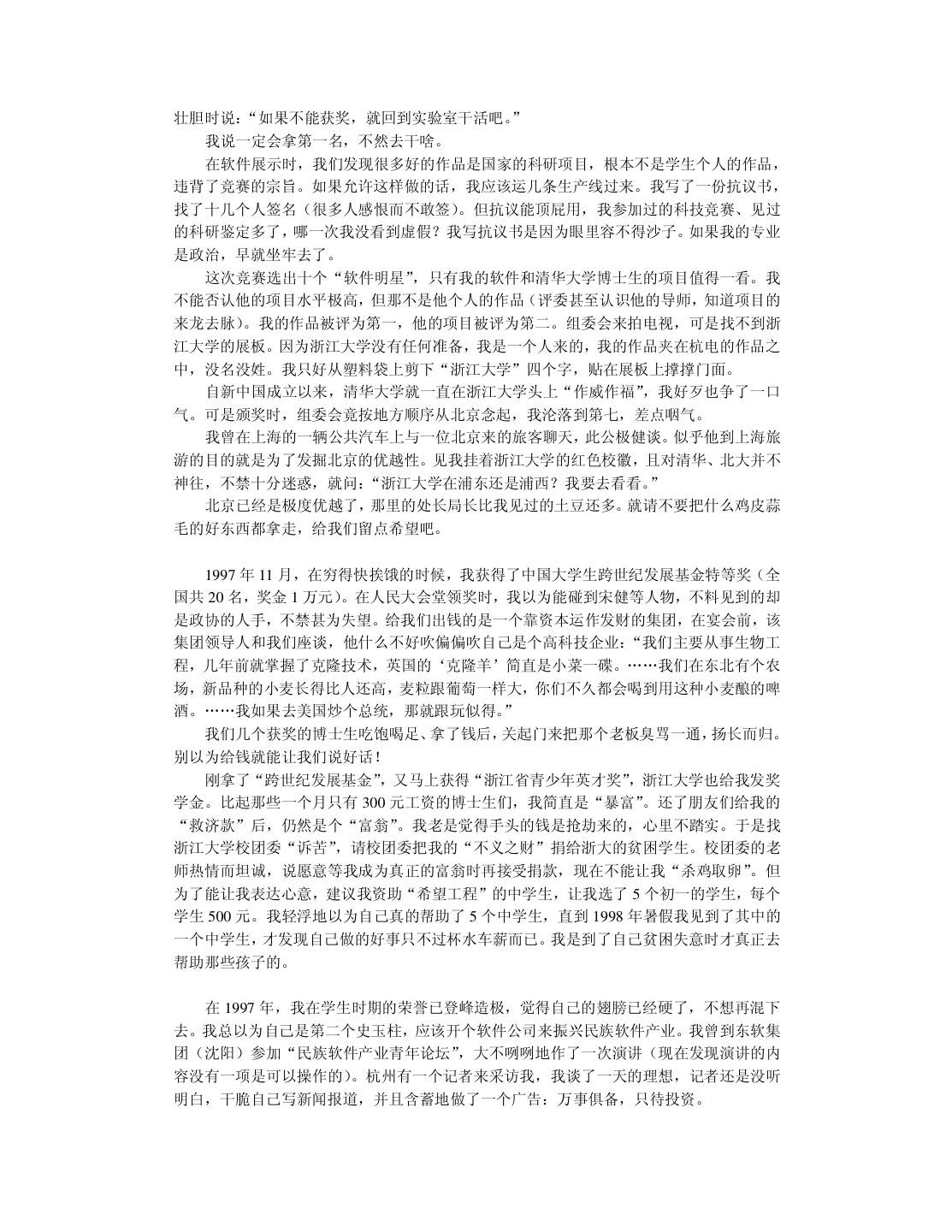 20 . 我在读本科和硕士研究生时,一直信奉“创造性的事业要靠激情来推动”。我把这个口 号贴在办公室里,并扔掉物理学专业天天编程。在读硕士研究生的第一年,我卖出了第一份 软件。到我读博士研究生的第一年,我心想事成地获得了全国大学生电脑大赛软件展示第一 名。那时候我自以为翅膀已经硬了,再回顾前些年的艰苦,不禁有“媳妇熬成婆”的悲壮感 觉。于是我在杭州这个小地方略作宣传,在 1997 年 10 月份开了一家软件公司。 我开始把“振兴民族软件产业”列入日程,并且提前担忧将来钱挣得太多用不完该怎么 办。半年之后,我开始为软件产品作宣传,可并没有出现订单如潮、接应不暇的形势(事实 上压根就没有反应)。我已经意识到市场没找对,但仍觉得软件中的技术很有价值,准备再 开创“东方不亮西方亮”的新局面。于是我向只有一面之缘尚在北大方正工作的一位朋友求 助。他是真真的软件高手,当我小心翼翼地展示约 10 万行 C++代码的软件时,他竞在十几 分钟内就指出多处重大的设计错误,使我目瞪口呆地意识到整个软件系统的价值为零。那种 心痛啊,就象眼睁睁看着孩子被狼吃掉一样。 1998 年 10 月,这位朋友再一次从北京飞到杭州,三下五除二替我把只活了一年的公司 给关闭掉。他放心不下,觉得我“恶病需用猛药补” ,于是意尤未尽地把我捉到北大方正插 在他管辖的部门,让我学习怎样做事情。北京寒冷的冬天可以营造一种凄凉的气氛,冲去一 切可以自我原谅的借口。我并不是太爱虚荣的人,知道这次失败是我的毛病积累到一定水准 忍不住喷发出来的结果。我绝不能以年纪尚轻不太懂市场与管理为理由轻率地敷衍过去。我 把自己察觉到的数十个毛病列出来,日后一个一个克服掉。……本书的大部分内容取自我在 一年前的教训录。 改错之后,现在我不仅不难过而且挺快乐。觉得第一次失败很浪漫,值得怀念。刚开始 写这本书时,我那位北京的朋友把脚伸到杭州来散步,顺手又给了我几帖药,可以用到我毕 业。看来缺点是改不完的,补短和扬长要一起来。 2.6 提高综合素责 前面给软件开发人员加了过多的赞誉。一个技术出色的程序员可以自豪,但不可以目空 一切。上天不可能赋于一个人太多的优点,以致于他没有表示谦虚的余地。 我们在求学时可能太功利太挑剔,导致知识结构非常单薄,只怕到了晚年也成不了大器。 当程序员擅长技术时,还要时刻留意弥补自己并不擅长的非技术才能。扬长补短才能提高综 合素质。 假如能回到中学时代,我希望能把文科学好。那时侯盛传“学好数理化,走遍天下都不 怕”。我读中学时很无知,鄙视一切文科,现在后悔莫及。高考语文成绩 54 分(只比我的期 望值低 6 分) 。写作文的最高目标就是不逃题,考试前我总是反复祈祷:我没干过坏事,保 佑我作文不逃题吧!上大学的第一天我竟然无法用普通话说出“去洗澡怎么走” ,只好晃动 澡票与辅导员打哑语。中学的历史、地理课也被我糟踏了,考试时只会填写任课老师某年某 月某日在我家乡英勇就义,比谁的成绩更接近零分。更让我沮丧的是,这些行径都不是我发 明的,我顶多是个跟屁虫而已,一点回忆的自豪感都没有。 扔掉文科只学理科并不等同于“放下包袱,轻装前进”,倒象是摘掉了控制系统的机车, 开不了多远就翻车了。我搞了八年的软件开发,没做出象样的软件来。倒是有同行意外发现 我的文笔不错,是当作家的料。我发现自己在不该开花的地方结了一颗瘦涩的果子。曹操之 子曹彰曾建议:“大丈夫当学卫青、霍去病,立功沙漠,长驱数十万众,纵横天下,何能为 博士耶?”要后悔的事情太多了,只能现在做得勤快些。明知自己不成大器,但愿意亡羊补 牢,力求学得更深更广。 不要让人觉得程序员只管钻研技术,可以不懂世事并且应该自由散漫。程序员不该因为